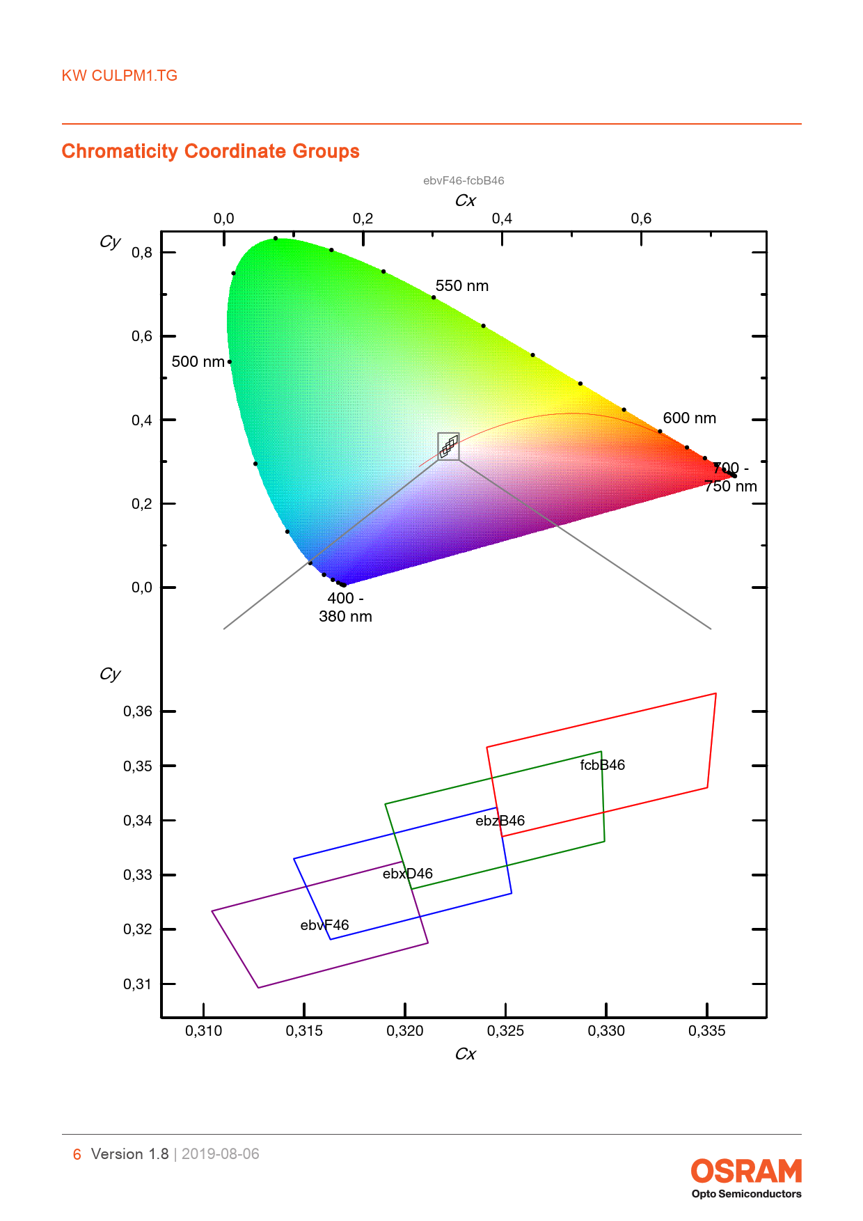 KW CULPM1.TG Chromaticity Coordinate Groups ebvF46-fcbB46 Cx 0,0 0,2 0,4 0,6 Cy 0,8 550 nm 0,6 500 nm 0,4 600 nm 700 - 750 nm 0,2 0,0 400 - 380 nm Cy 0,36 0,35 fcbB46 0,34 ebzB46 0,33 ebxD46 0,32 ebvF46 0,31 0,310 0,315 0,320 0,325 0,330 0,335 Cx 6 Version 1.8 | 2019-08-06