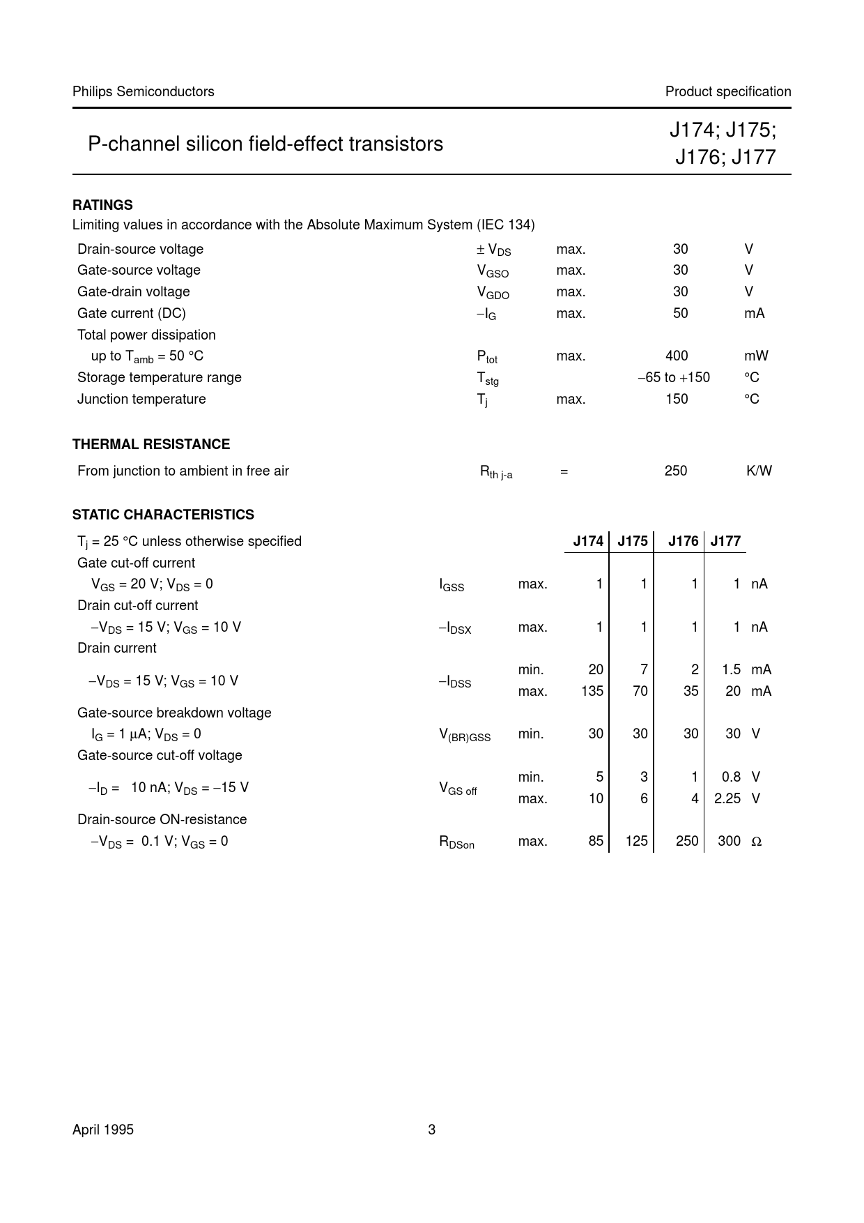 Philips Semiconductors Product specification J174; J175; P-channel silicon field-effect transistors J176; J177 RATINGS Limiting values in accordance with the Absolute Maximum System (IEC 134) Drain-source voltage ± VDS max. 30 V Gate-source voltage VGSO max. 30 V Gate-drain voltage VGDO max. 30 V Gate current (DC) −IG max. 50 mA Total power dissipation up to Tamb = 50 °C Ptot max. 400 mW Storage temperature range Tstg −65 to +150 °C Junction temperature Tj max. 150 °C THERMAL RESISTANCE From junction to ambient in free air Rth j-a = 250 K/W STATIC CHARACTERISTICS Tj = 25 °C unless otherwise specified J174J175J176 J177 Gate cut-off current VGS = 20 V; VDS = 0 IGSS max. 1 1 1 1 nA Drain cut-off current −VDS = 15 V; VGS = 10 V −IDSX max. 1 1 1 1 nA Drain current min. 20 7 2 1.5 mA −VDS = 15 V; VGS = 10 V −IDSS max. 135 70 35 20 mA Gate-source breakdown voltage IG = 1 µA; VDS = 0 V(BR)GSS min. 30 30 30 30 V Gate-source cut-off voltage min. 5 3 1 0.8 V −ID = 10 nA; VDS = −15 V VGS off max. 10 6 4 2.25 V Drain-source ON-resistance −VDS = 0.1 V; VGS = 0 RDSon max. 85 125 250 300 Ω April 1995 3 Document Outline DESCRIPTION PINNING QUICK REFERENCE DATA RATINGS THERMAL RESISTANCE STATIC CHARACTERISTICS DYNAMIC CHARACTERISTICS PACKAGE OUTLINE SOT54 DEFINITIONS