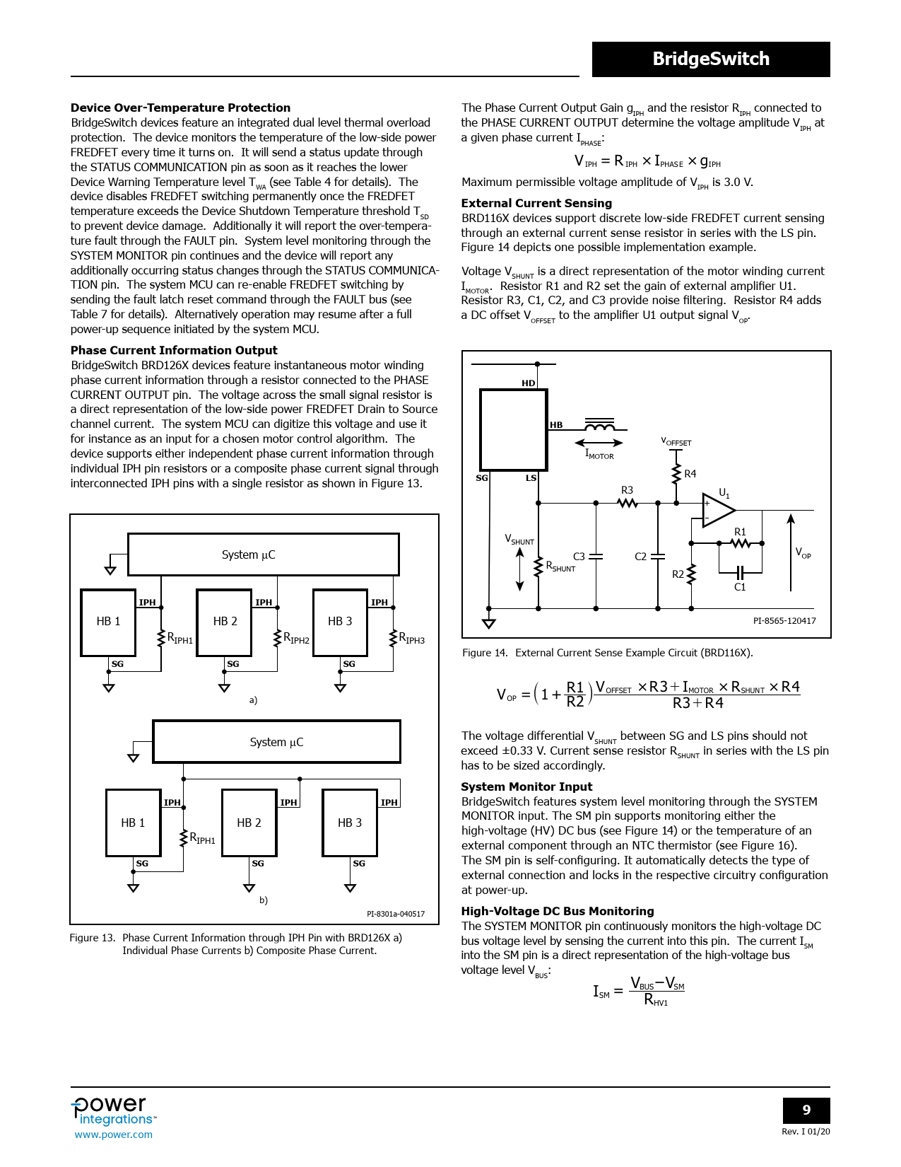 The SYSTEM MONITOR pin continuously monitors the high-voltage DC Figure 13. Phase Current Information through IPH Pin with BRD126X a) bus voltage level by sensing the current into this pin. The current I Individual Phase Currents b) Composite Phase Current. SM into the SM pin is a direct representation of the high-voltage bus voltage level V : BUS I VBUS VSM SM = – RHV1