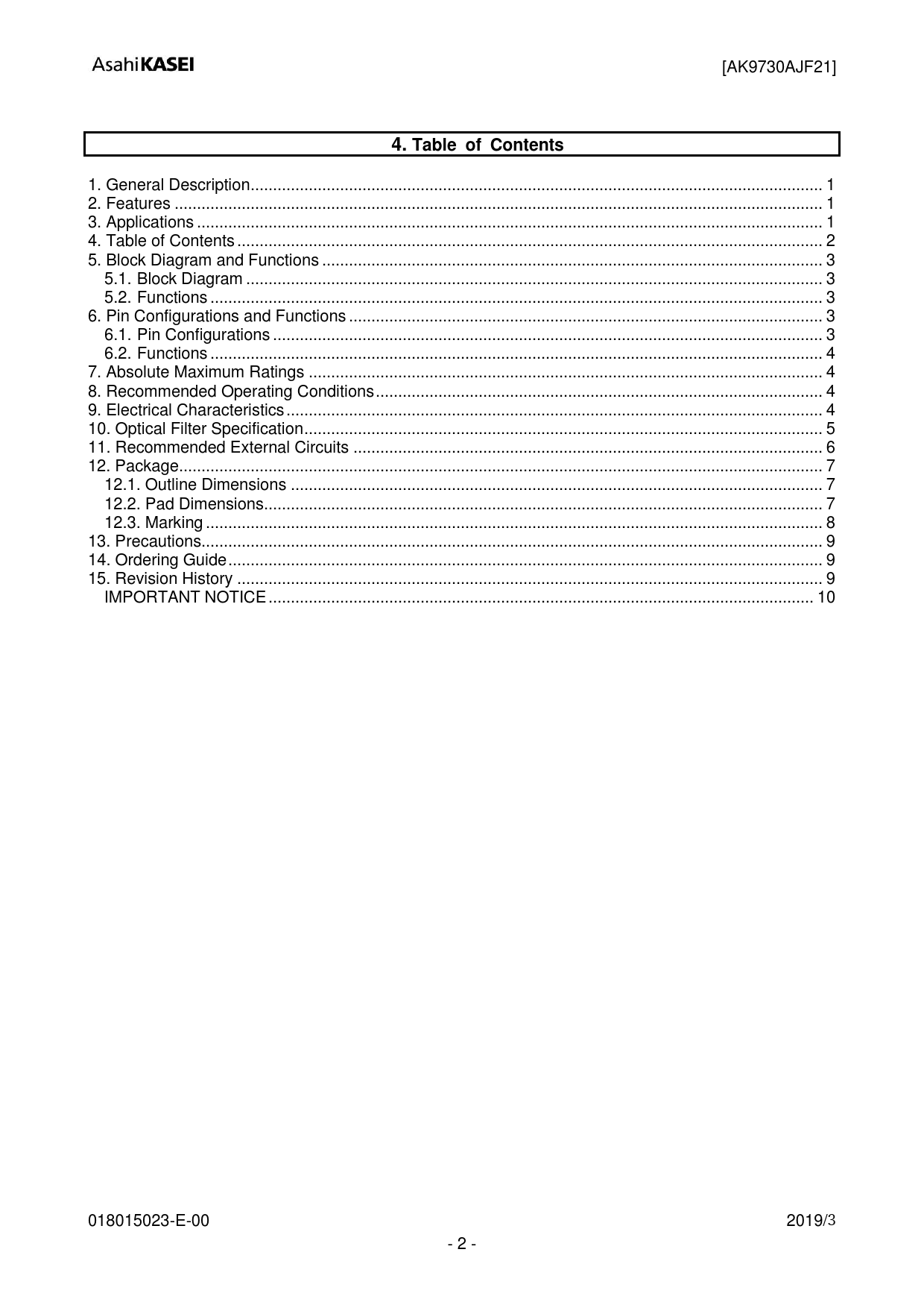 1. General Description .. 1 2. Features ... 1 3. Applications .. 1 4. Table of Contents ... 2 5. Block Diagram and Functions .. 3 5.1. Block Diagram ... 3 5.2. Functions ... 3 6. Pin Configurations and Functions .. 3 6.1. Pin Configurations ... 3 6.2. Functions ... 4 7. Absolute Maximum Ratings ... 4 8. Recommended Operating Conditions .. 4 9. Electrical Characteristics .. 4 10. Optical Filter Specification .. 5 11. Recommended External Circuits ... 6 12. Package .. 7 12.1. Outline Dimensions ... 7 12.2. Pad Dimensions... 7 12.3. Marking .. 8 13. Precautions... 9 14. Ordering Guide ... 9 15. Revision History ... 9 IMPORTANT NOTICE .. 10 018015023-E-00 2019/3 - 2 -