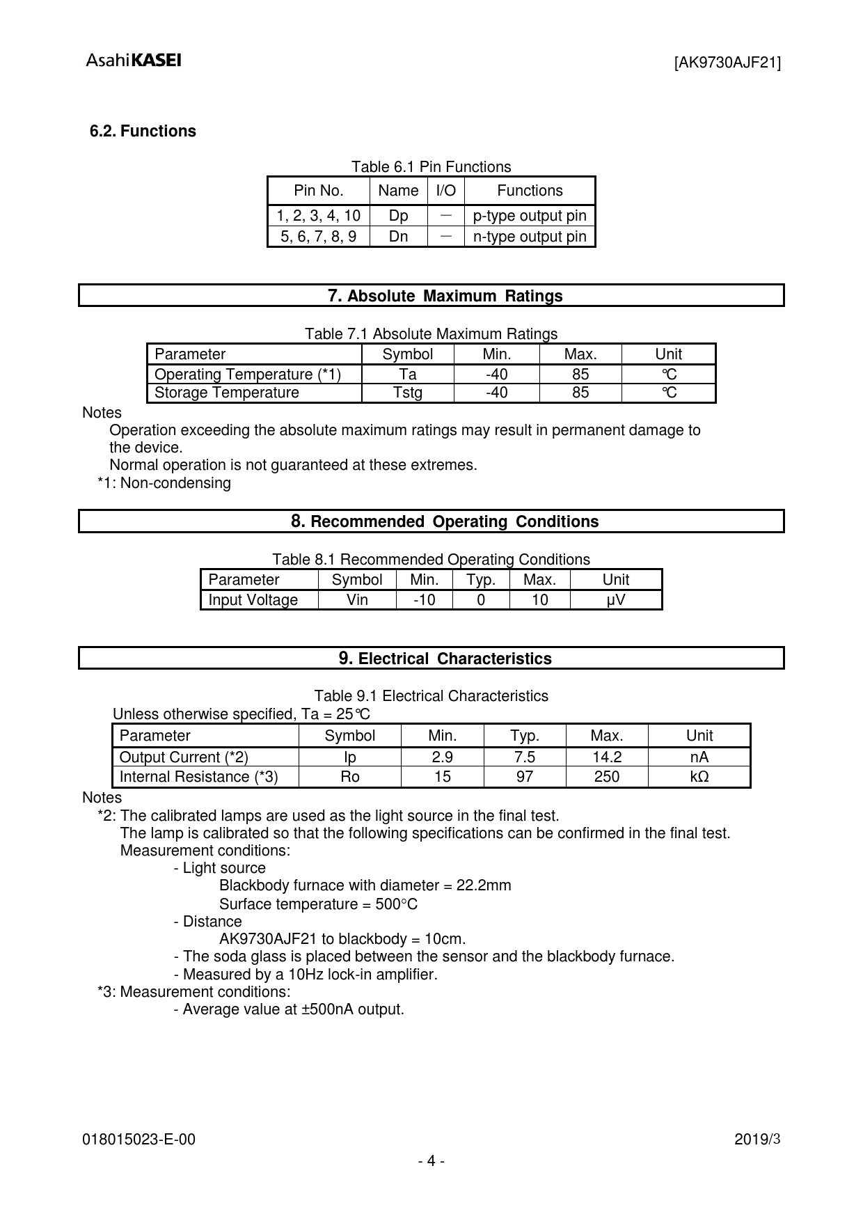 Table 9.1 Electrical Characteristics Unless otherwise specified, Ta = 25°C Parameter Symbol Min. Typ. Max. Unit Output Current (*2) Ip 2.9 7.5 14.2 nA Internal Resistance (*3) Ro 15 97 250 kΩ Notes *2: The calibrated lamps are used as the light source in the final test. The lamp is calibrated so that the following specifications can be confirmed in the final test. Measurement conditions: - Light source Blackbody furnace with diameter = 22.2mm Surface temperature = 500C - Distance AK9730AJF21 to blackbody = 10cm. - The soda glass is placed between the sensor and the blackbody furnace. - Measured by a 10Hz lock-in amplifier. *3: Measurement conditions: - Average value at ±500nA output. 018015023-E-00 2019/3 - 4 -