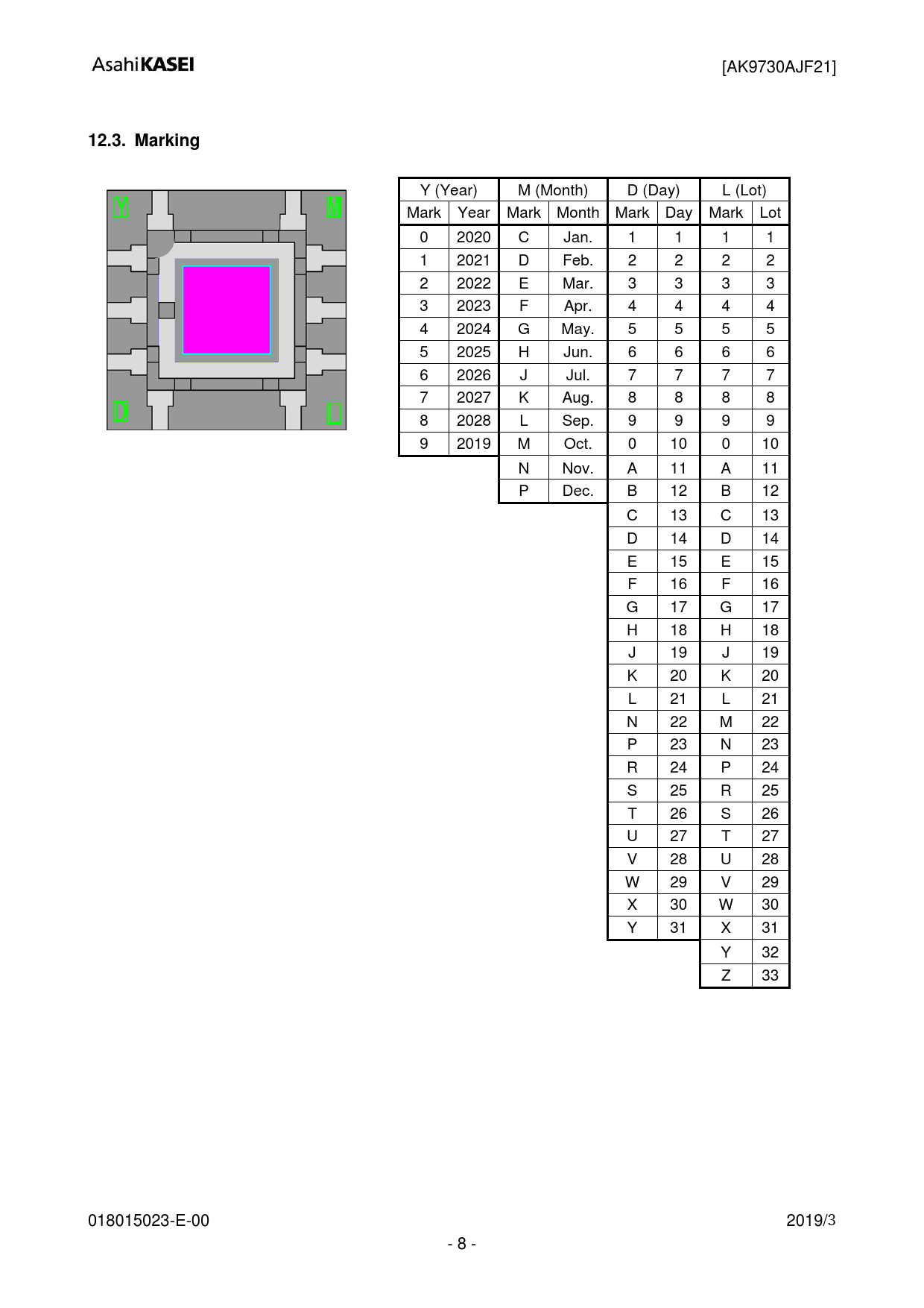 [AK9730AJF21] 12.3. Marking Y (Year) M (Month) D (Day) L (Lot) Mark Year Mark Month Mark Day Mark Lot 0 2020 C Jan. 1 1 1 1 1 2021 D Feb. 2 2 2 2 2 2022 E Mar. 3 3 3 3 3 2023 F Apr. 4 4 4 4 4 2024 G May. 5 5 5 5 5 2025 H Jun. 6 6 6 6 6 2026 J Jul. 7 7 7 7 7 2027 K Aug. 8 8 8 8 8 2028 L Sep. 9 9 9 9 9 2019 M Oct. 0 10 0 10 N Nov. A 11 A 11 P Dec. B 12 B 12 C 13 C 13 D 14 D 14 E 15 E 15 F 16 F 16 G 17 G 17 H 18 H 18 J 19 J 19 K 20 K 20 L 21 L 21 N 22 M 22 P 23 N 23 R 24 P 24 S 25 R 25 T 26 S 26 U 27 T 27 V 28 U 28 W 29 V 29 X 30 W 30 Y 31 X 31 Y 32 Z 33 018015023-E-00 2019/3 - 8 -