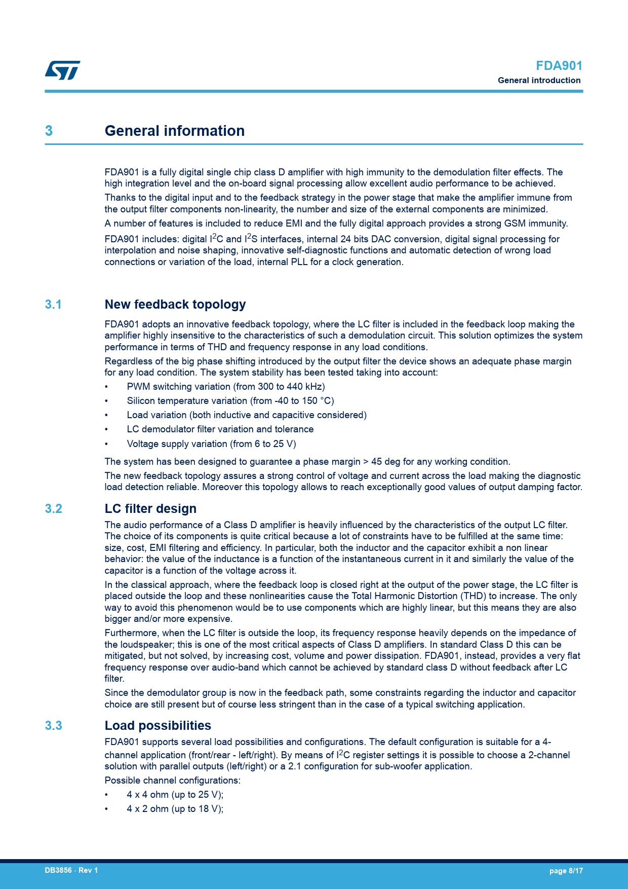 FDA901. General introduction. General information. 3.1. New feedback topology. 3.2. LC filter design. 3.3. Load possibilities. DB3856