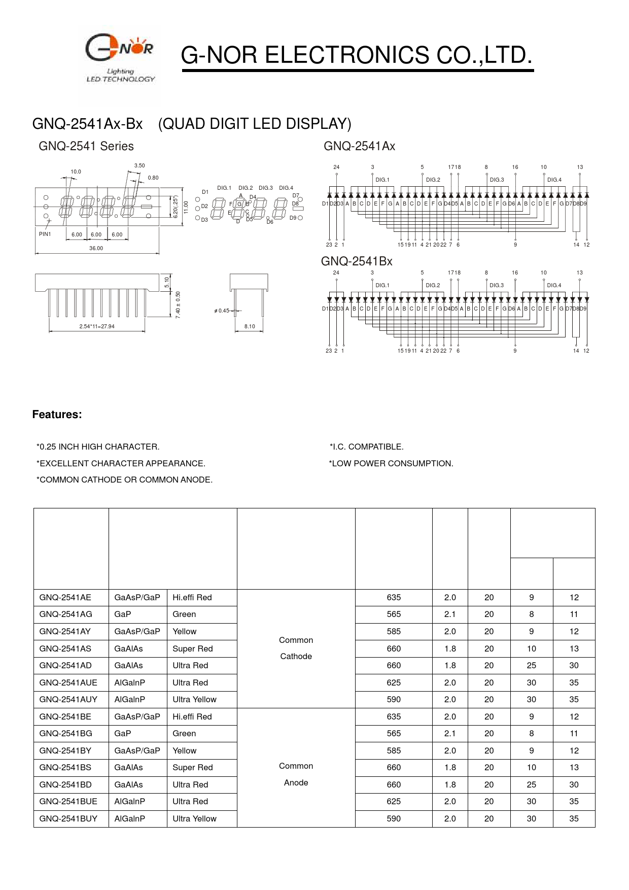 *0.25 INCH HIGH CHARACTER. *I.C. COMPATIBLE. *EXCELLENT CHARACTER APPEARANCE. *LOW POWER CONSUMPTION. *COMMON CATHODE OR COMMON ANODE. Intensity Common Cathode Peak Vf Per Segment Part If EMITTED COLOR or Wavelength (v) (mcd) Number (mA) Common Anode (nm) Typ Min. Typ. GNQ-2541AE GaAsP/GaP Hi.effi Red 635 2.0 20 9 12 GNQ-2541AG GaP Green 565 2.1 20 8 11 GNQ-2541AY GaAsP/GaP Yellow 585 2.0 20 9 12 Common GNQ-2541AS GaAlAs Super Red 660 1.8 20 10 13 Cathode GNQ-2541AD GaAlAs Ultra Red 660 1.8 20 25 30 GNQ-2541AUE AlGalnP Ultra Red 625 2.0 20 30 35 GNQ-2541AUY AlGalnP Ultra Yellow 590 2.0 20 30 35 GNQ-2541BE GaAsP/GaP Hi.effi Red 635 2.0 20 9 12 GNQ-2541BG GaP Green 565 2.1 20 8 11 GNQ-2541BY GaAsP/GaP Yellow 585 2.0 20 9 12 GNQ-2541BS GaAlAs Super Red Common 660 1.8 20 10 13 GNQ-2541BD GaAlAs Ultra Red Anode 660 1.8 20 25 30 GNQ-2541BUE AlGalnP Ultra Red 625 2.0 20 30 35 GNQ-2541BUY AlGalnP Ultra Yellow 590 2.0 20 30 35