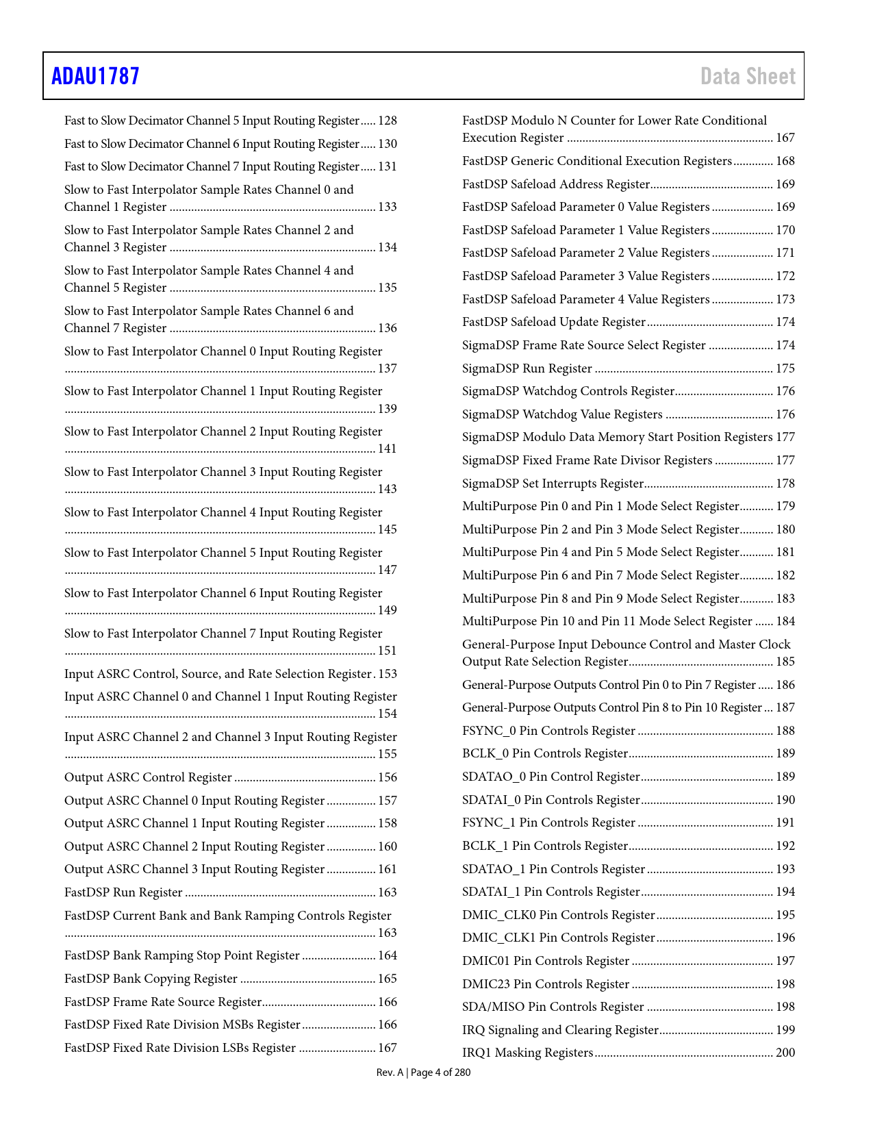 Fast to Slow Decimator Channel 5 Input Routing Register ... 128  FastDSP Modulo N Counter for Lower Rate Conditional Fast to Slow Decimator Channel 6 Input Routing Register ... 130  Execution Register ... 167  Fast to Slow Decimator Channel 7 Input Routing Register ... 131  FastDSP Generic Conditional Execution Registers ... 168  Slow to Fast Interpolator Sample Rates Channel 0 and FastDSP Safeload Address Register.. 169  Channel 1 Register ... 133  FastDSP Safeload Parameter 0 Value Registers .. 169  Slow to Fast Interpolator Sample Rates Channel 2 and FastDSP Safeload Parameter 1 Value Registers .. 170  Channel 3 Register ... 134  FastDSP Safeload Parameter 2 Value Registers .. 171  Slow to Fast Interpolator Sample Rates Channel 4 and FastDSP Safeload Parameter 3 Value Registers .. 172  Channel 5 Register ... 135  FastDSP Safeload Parameter 4 Value Registers .. 173  Slow to Fast Interpolator Sample Rates Channel 6 and Channel 7 Register ... 136  FastDSP Safeload Update Register ... 174  Slow to Fast Interpolator Channel 0 Input Routing Register SigmaDSP Frame Rate Source Select Register ... 174  ... 137  SigmaDSP Run Register .. 175  Slow to Fast Interpolator Channel 1 Input Routing Register SigmaDSP Watchdog Controls Register.. 176  ... 139  SigmaDSP Watchdog Value Registers ... 176  Slow to Fast Interpolator Channel 2 Input Routing Register SigmaDSP Modulo Data Memory Start Position Registers 177  ... 141  SigmaDSP Fixed Frame Rate Divisor Registers ... 177  Slow to Fast Interpolator Channel 3 Input Routing Register ... 143  SigmaDSP Set Interrupts Register .. 178  Slow to Fast Interpolator Channel 4 Input Routing Register MultiPurpose Pin 0 and Pin 1 Mode Select Register ... 179  ... 145  MultiPurpose Pin 2 and Pin 3 Mode Select Register ... 180  Slow to Fast Interpolator Channel 5 Input Routing Register MultiPurpose Pin 4 and Pin 5 Mode Select Register ... 181  ... 147  MultiPurpose Pin 6 and Pin 7 Mode Select Register ... 182  Slow to Fast Interpolator Channel 6 Input Routing Register MultiPurpose Pin 8 and Pin 9 Mode Select Register ... 183  ... 149  MultiPurpose Pin 10 and Pin 11 Mode Select Register .. 184  Slow to Fast Interpolator Channel 7 Input Routing Register ... 151  General-Purpose Input Debounce Control and Master Clock Output Rate Selection Register ... 185  Input ASRC Control, Source, and Rate Selection Register . 153  General-Purpose Outputs Control Pin 0 to Pin 7 Register ... 186  Input ASRC Channel 0 and Channel 1 Input Routing Register ... 154  General-Purpose Outputs Control Pin 8 to Pin 10 Register ... 187  Input ASRC Channel 2 and Channel 3 Input Routing Register FSYNC_0 Pin Controls Register .. 188  ... 155  BCLK_0 Pin Controls Register ... 189  Output ASRC Control Register .. 156  SDATAO_0 Pin Control Register ... 189  Output ASRC Channel 0 Input Routing Register .. 157  SDATAI_0 Pin Controls Register ... 190  Output ASRC Channel 1 Input Routing Register .. 158  FSYNC_1 Pin Controls Register .. 191  Output ASRC Channel 2 Input Routing Register .. 160  BCLK_1 Pin Controls Register ... 192  Output ASRC Channel 3 Input Routing Register .. 161  SDATAO_1 Pin Controls Register ... 193  FastDSP Run Register .. 163  SDATAI_1 Pin Controls Register ... 194  FastDSP Current Bank and Bank Ramping Controls Register DMIC_CLK0 Pin Controls Register .. 195  ... 163  DMIC_CLK1 Pin Controls Register .. 196  FastDSP Bank Ramping Stop Point Register .. 164  DMIC01 Pin Controls Register .. 197  FastDSP Bank Copying Register .. 165  DMIC23 Pin Controls Register .. 198  FastDSP Frame Rate Source Register ... 166  SDA/MISO Pin Controls Register ... 198  FastDSP Fixed Rate Division MSBs Register .. 166  IRQ Signaling and Clearing Register ... 199  FastDSP Fixed Rate Division LSBs Register ... 167  IRQ1 Masking Registers .. 200  Rev. A | Page 4 of 280 Document Outline FEATURES APPLICATIONS GENERAL DESCRIPTION TABLE OF CONTENTS REVISION HISTORY FUNCTIONAL BLOCK DIAGRAM SPECIFICATIONS ANALOG PERFORMANCE SPECIFICATIONS CRYSTAL AMPLIFIER SPECIFICATIONS DIGITAL INPUT AND OUTPUT SPECIFICATIONS POWER SUPPLY SPECIFICATIONS POWER-DOWN CURRENT TYPICAL POWER CONSUMPTION DIGITAL FILTERS DIGITAL TIMING SPECIFICATIONS Digital Timing Diagrams ABSOLUTE MAXIMUM RATINGS THERMAL RESISTANCE ESD CAUTION PIN CONFIGURATION AND FUNCTION DESCRIPTIONS TYPICAL PERFORMANCE CHARACTERISTICS SYSTEM BLOCK DIAGRAM THEORY OF OPERATION SYSTEM CLOCKING AND POWER-UP POWER-DOWN OPERATION AND OPTIONS EXAMPLE ADC TO DAC POWER-UP DVDD LDO REGULATOR CLOCK INITIALIZATION PLL Enabled Setup Control Port Access During Initialization PLL PLL Bypass Operation Input Clock Divider Integer Mode Fractional Mode MULTICHIP PHASE SYNCHRONIZATION CLOCK OUTPUT POWER SUPPLY SEQUENCING Power-Down Considerations SIGNAL ROUTING INPUT SIGNAL PATHS ANALOG INPUTS Phase Difference Various Signal Path ADAU1787 Input Impedance Analog Microphone Inputs Analog Line Inputs Precharging Input Capacitors Microphone Bias PGAs DIGITAL MICROPHONE INPUTS Digital Microphone Volume Control ADCs ADC Full-Scale Level Digital ADC Volume Control Filtering OUTPUT SIGNAL PATHS ANALOG OUTPUTS Headphone Output Line Outputs Pop and Click Suppression DACs DAC Full-Scale Level Digital DAC Volume Control and Filtering PDM OUTPUTS PDM Outputs Full-Scale Level PDM Outputs Volume Control and Filtering ASRCs INTERPOLATION AND DECIMATION BLOCKS SIGNAL LEVELS FastDSP CORE INSTRUCTIONS FILTER PRECISION FLAGS AND CONDITIONAL EXECUTION INPUT SOURCES POWER AND RUN CONTROL DATA MEMORY PARAMETERS PARAMETER BANK SWITCHING PARAMETER BANK COPYING PARAMETER MEMORY ACCESS FastDSP PARAMETER SAFELOAD SigmaDSP CORE Signal Processing Details Program Counter Watchdog Features Numeric Formats Numeric Format 5.23 Programming READ/WRITE DATA FORMATS SOFTWARE SAFELOAD FastDSP SAFELOAD PROGRAM RAM, PARAMETER RAM, AND DATA RAM PROGRAM RAM PARAMETER RAM DATA RAM POWER SAVING OPTIONS ADC Bias Current Control DAC Bias Current Control 