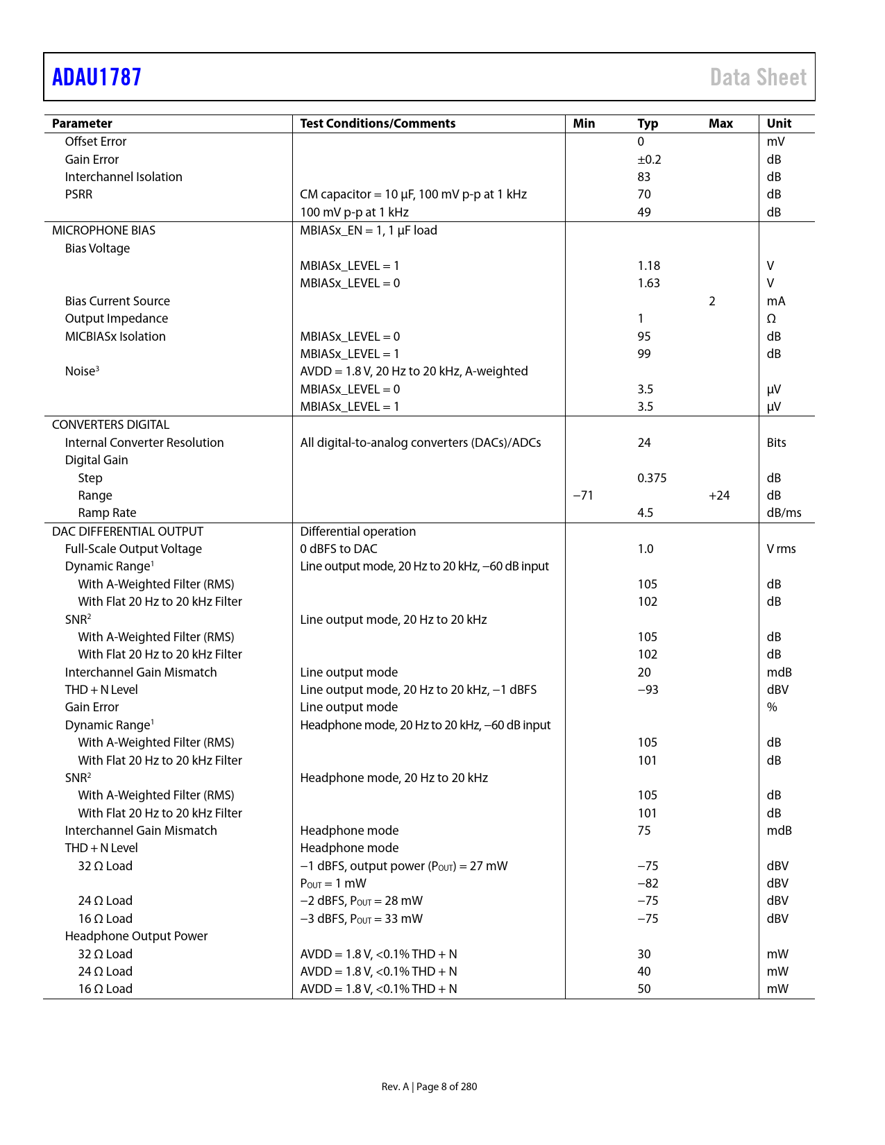 link to page 9 link to page 9 link to page 9 link to page 9 link to page 9 ADAU1787Data SheetParameter TestConditions/CommentsMinTypMaxUnit Offset Error 0 mV Gain Error ±0.2 dB Interchannel Isolation 83 dB PSRR CM capacitor = 10 μF, 100 mV p-p at 1 kHz 70 dB 100 mV p-p at 1 kHz 49 dB MICROPHONE BIAS MBIASx_EN = 1, 1 μF load Bias Voltage MBIASx_LEVEL = 1 1.18 V MBIASx_LEVEL = 0 1.63 V Bias Current Source 2 mA Output Impedance 1 Ω MICBIASx Isolation MBIASx_LEVEL = 0 95 dB MBIASx_LEVEL = 1 99 dB Noise3 AVDD = 1.8 V, 20 Hz to 20 kHz, A-weighted MBIASx_LEVEL = 0 3.5 μV MBIASx_LEVEL = 1 3.5 μV CONVERTERS DIGITAL Internal Converter Resolution All digital-to-analog converters (DACs)/ADCs 24 Bits Digital Gain Step 0.375 dB Range −71 +24 dB Ramp Rate 4.5 dB/ms DAC DIFFERENTIAL OUTPUT Differential operation Full-Scale Output Voltage 0 dBFS to DAC 1.0 V rms Dynamic Range1 Line output mode, 20 Hz to 20 kHz, −60 dB input With A-Weighted Filter (RMS) 105 dB With Flat 20 Hz to 20 kHz Filter 102 dB SNR2 Line output mode, 20 Hz to 20 kHz With A-Weighted Filter (RMS) 105 dB With Flat 20 Hz to 20 kHz Filter 102 dB Interchannel Gain Mismatch Line output mode 20 mdB THD + N Level Line output mode, 20 Hz to 20 kHz, −1 dBFS −93 dBV Gain Error Line output mode % Dynamic Range1 Headphone mode, 20 Hz to 20 kHz, −60 dB input With A-Weighted Filter (RMS) 105 dB With Flat 20 Hz to 20 kHz Filter 101 dB SNR2 Headphone mode, 20 Hz to 20 kHz With A-Weighted Filter (RMS) 105 dB With Flat 20 Hz to 20 kHz Filter 101 dB Interchannel Gain Mismatch Headphone mode 75 mdB THD + N Level Headphone mode 32 Ω Load −1 dBFS, output power (POUT) = 27 mW −75 dBV POUT = 1 mW −82 dBV 24 Ω Load −2 dBFS, POUT = 28 mW −75 dBV 16 Ω Load −3 dBFS, POUT = 33 mW −75 dBV Headphone Output Power 32 Ω Load AVDD = 1.8 V, <0.1% THD + N 30 mW 24 Ω Load AVDD = 1.8 V, <0.1% THD + N 40 mW 16 Ω Load AVDD = 1.8 V, <0.1% THD + N 50 mW Rev. A | Page 8 of 280 Document Outline FEATURES APPLICATIONS GENERAL DESCRIPTION TABLE OF CONTENTS REVISION HISTORY FUNCTIONAL BLOCK DIAGRAM SPECIFICATIONS ANALOG PERFORMANCE SPECIFICATIONS CRYSTAL AMPLIFIER SPECIFICATIONS DIGITAL INPUT AND OUTPUT SPECIFICATIONS POWER SUPPLY SPECIFICATIONS POWER-DOWN CURRENT TYPICAL POWER CONSUMPTION DIGITAL FILTERS DIGITAL TIMING SPECIFICATIONS Digital Timing Diagrams ABSOLUTE MAXIMUM RATINGS THERMAL RESISTANCE ESD CAUTION PIN CONFIGURATION AND FUNCTION DESCRIPTIONS TYPICAL PERFORMANCE CHARACTERISTICS SYSTEM BLOCK DIAGRAM THEORY OF OPERATION SYSTEM CLOCKING AND POWER-UP POWER-DOWN OPERATION AND OPTIONS EXAMPLE ADC TO DAC POWER-UP DVDD LDO REGULATOR CLOCK INITIALIZATION PLL Enabled Setup Control Port Access During Initialization PLL PLL Bypass Operation Input Clock Divider Integer Mode Fractional Mode MULTICHIP PHASE SYNCHRONIZATION CLOCK OUTPUT POWER SUPPLY SEQUENCING Power-Down Considerations SIGNAL ROUTING INPUT SIGNAL PATHS ANALOG INPUTS Phase Difference Various Signal Path ADAU1787 Input Impedance Analog Microphone Inputs Analog Line Inputs Precharging Input Capacitors Microphone Bias PGAs DIGITAL MICROPHONE INPUTS Digital Microphone Volume Control ADCs ADC Full-Scale Level Digital ADC Volume Control Filtering OUTPUT SIGNAL PATHS ANALOG OUTPUTS Headphone Output Line Outputs Pop and Click Suppression DACs DAC Full-Scale Level Digital DAC Volume Control and Filtering PDM OUTPUTS PDM Outputs Full-Scale Level PDM Outputs Volume Control and Filtering ASRCs INTERPOLATION AND DECIMATION BLOCKS SIGNAL LEVELS FastDSP CORE INSTRUCTIONS FILTER PRECISION FLAGS AND CONDITIONAL EXECUTION INPUT SOURCES POWER AND RUN CONTROL DATA MEMORY PARAMETERS PARAMETER BANK SWITCHING PARAMETER BANK COPYING PARAMETER MEMORY ACCESS FastDSP PARAMETER SAFELOAD SigmaDSP CORE Signal Processing Details Program Counter Watchdog Features Numeric Formats Numeric Format 5.23 Programming READ/WRITE DATA FORMATS SOFTWARE SAFELOAD FastDSP SAFELOAD PROGRAM RAM, PARAMETER RAM, AND DATA RAM PROGRAM RAM PARAMETER RAM DATA RAM POWER SAVING OPTIONS ADC Bias Current Control DAC Bias Current Control DAC Low Power Modes PLL Bypass SigmaDSP Clock Speed Control Asynchronous Sample Rate Converters Low Power Modes CONTROL PORT BURST MODE COMMUNICATION READING AND WRITING TO MEMORIES I2C PORT Addressing I2C Read and Write Operations SPI PORT R/WB Subaddress Data Bytes SELF BOOT EEPROM Size CRC Delay Boot Time MULTIPURPOSE PINS Interrupts Pin Controls SERIAL DATA PORTS APPLICATIONS INFORMATION POWER SUPPLY BYPASS CAPACITORS LAYOUT GROUNDING PCB STACKUP REGISTER SUMMARY REGISTER DETAILS ADI VENDOR ID REGISTER DEVICE ID REGISTERS REVISION CODE REGISTER ADC, DAC, HEADPHONE POWER CONTROLS REGISTER PLL, MICROPHONE BIAS, AND PGA POWER CONTROLS REGISTER DIGITAL MICROPHONE POWER CONTROLS REGISTER SERIAL PORT, PDM OUTPUT, AND DIGITAL MICROPHONE CLK POWER CONTROLS REGISTER DSP POWER CONTROLS REGISTER ASRC POWER CONTROLS REGISTER INTERPOLATOR POWER CONTROLS REGISTER DECIMATOR POWER CONTROLS REGISTER STATE RETENTION CONTROLS REGISTER CHIP POWER CONTROL REGISTER CLOCK CONTROL REGISTER PLL INPUT DIVIDER REGISTER PLL FEEDBACK INTEGER DIVIDER (LSBs REGISTER) PLL FEEDBACK INTEGER DIVIDER (MSBs REGISTER) PLL FRACTIONAL NUMERATOR VALUE (LSBs REGISTER) PLL FRACTIONAL NUMERATOR VALUE (MSBs REGISTER) PLL FRACTIONAL DENOMINATOR (LSBs REGISTER) PLL FRACTIONAL DENOMINATOR (MSBs REGISTER) PLL UPDATE REGISTER ADC SAMPLE RATE CONTROL REGISTER ADC IBIAS CONTROLS REGISTER ADC HPF CONTROL REGISTER ADC MUTE AND COMPENSATION CONTROL REGISTER ANALOG INPUT PRECHARGE TIME REGISTER ADC CHANNEL MUTES REGISTER ADC CHANNEL 0 VOLUME CONTROL REGISTER ADC CHANNEL 1 VOLUME CONTROL REGISTER ADC CHANNEL 2 VOLUME CONTROL REGISTER ADC CHANNEL 3 VOLUME CONTROL REGISTER PGA CHANNEL 0 GAIN CONTROL MSBs, MUTE, BOOST, SLEW REGISTER PGA CHANNEL 0 GAIN CONTROL LSBs REGISTER PGA CHANNEL 1 GAIN CONTROL MSBs, MUTE, BOOST, SLEW REGISTER PGA CHANNEL 1 GAIN CONTROL LSBS REGISTER PGA CHANNEL 2 GAIN CONTROL MSBs, MUTE, BOOST, SLEW REGISTER PGA CHANNEL 2 GAIN CONTROL LSBS 