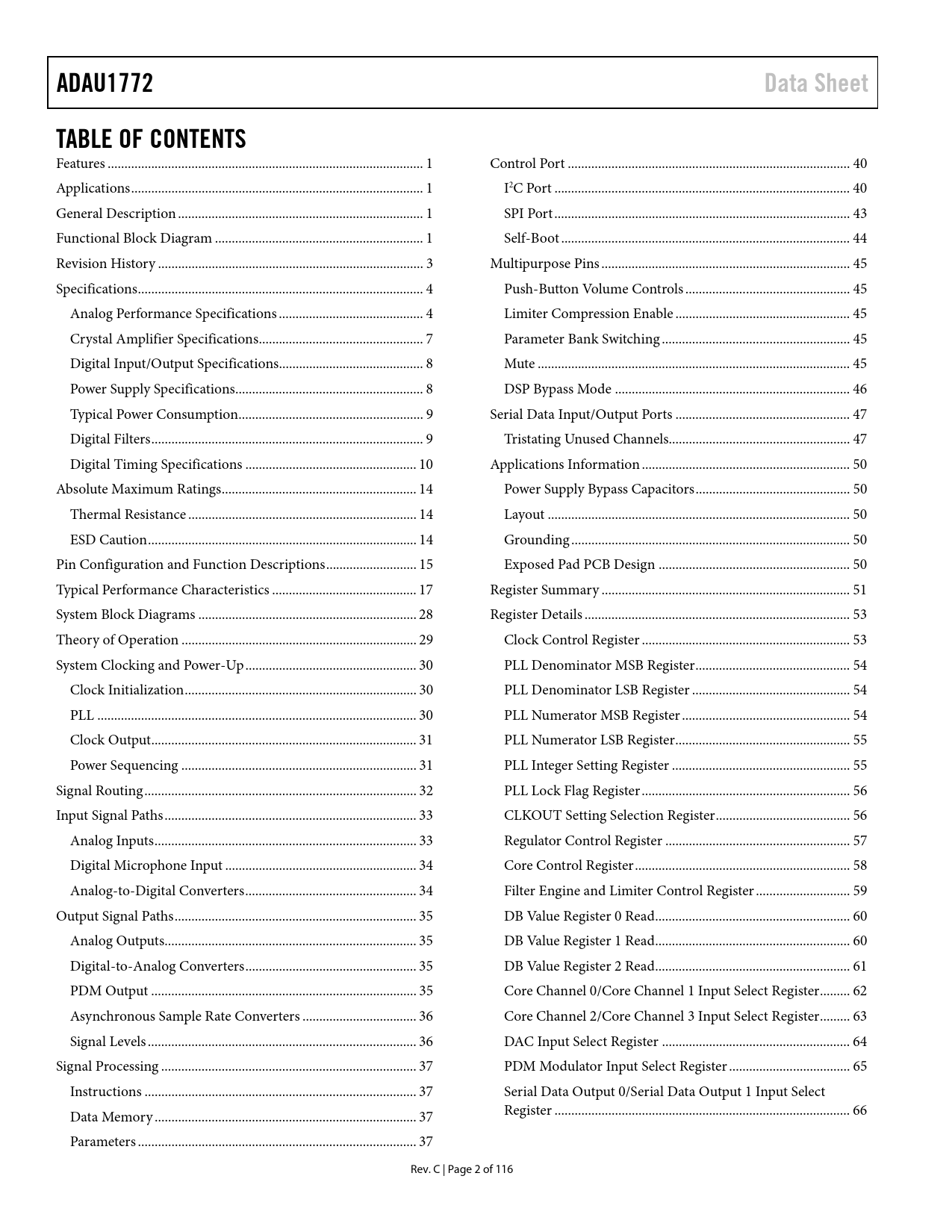 link to page 1 link to page 1 link to page 1 link to page 1 link to page 3 link to page 4 link to page 4 link to page 7 link to page 8 link to page 8 link to page 9 link to page 9 link to page 10 link to page 14 link to page 14 link to page 14 link to page 15 link to page 17 link to page 28 link to page 29 link to page 30 link to page 30 link to page 30 link to page 31 link to page 31 link to page 32 link to page 33 link to page 33 link to page 34 link to page 34 link to page 35 link to page 35 link to page 35 link to page 35 link to page 36 link to page 36 link to page 37 link to page 37 link to page 37 link to page 37 link to page 40 link to page 40 link to page 43 link to page 44 link to page 45 link to page 45 link to page 45 link to page 45 link to page 45 link to page 46 link to page 47 link to page 47 link to page 50 link to page 50 link to page 50 link to page 50 link to page 50 link to page 51 link to page 53 link to page 53 link to page 54 link to page 54 link to page 54 link to page 55 link to page 55 link to page 56 link to page 56 link to page 57 link to page 58 link to page 59 link to page 60 link to page 60 link to page 61 link to page 62 link to page 63 link to page 64 link to page 65 link to page 66 link to page 66 ADAU1772Data SheetTABLE OF CONTENTS Features .. 1 Control Port .. 40 Applications ... 1 I2C Port .. 40 General Description ... 1 SPI Port .. 43 Functional Block Diagram .. 1 Self-Boot .. 44 Revision History ... 3 Multipurpose Pins .. 45 Specifications ... 4 Push-Button Volume Controls ... 45 Analog Performance Specifications ... 4 Limiter Compression Enable .. 45 Crystal Amplifier Specifications ... 7 Parameter Bank Switching .. 45 Digital Input/Output Specifications... 8 Mute ... 45 Power Supply Specifications.. 8 DSP Bypass Mode .. 46 Typical Power Consumption ... 9 Serial Data Input/Output Ports .. 47 Digital Filters ... 9 Tristating Unused Channels.. 47 Digital Timing Specifications ... 10 Applications Information .. 50 Absolute Maximum Ratings .. 14 Power Supply Bypass Capacitors .. 50 Thermal Resistance .. 14 Layout .. 50 ESD Caution .. 14 Grounding ... 50 Pin Configuration and Function Descriptions ... 15 Exposed Pad PCB Design ... 50 Typical Performance Characteristics ... 17 Register Summary .. 51 System Block Diagrams ... 28 Register Details ... 53 Theory of Operation .. 29 Clock Control Register .. 53 System Clocking and Power-Up ... 30 PLL Denominator MSB Register .. 54 Clock Initialization ... 30 PLL Denominator LSB Register ... 54 PLL ... 30 PLL Numerator MSB Register .. 54 Clock Output ... 31 PLL Numerator LSB Register .. 55 Power Sequencing .. 31 PLL Integer Setting Register ... 55 Signal Routing ... 32 PLL Lock Flag Register .. 56 Input Signal Paths ... 33 CLKOUT Setting Selection Register .. 56 Analog Inputs .. 33 Regulator Control Register ... 57 Digital Microphone Input ... 34 Core Control Register .. 58 Analog-to-Digital Converters ... 34 Filter Engine and Limiter Control Register .. 59 Output Signal Paths .. 35 DB Value Register 0 Read .. 60 Analog Outputs... 35 DB Value Register 1 Read .. 60 Digital-to-Analog Converters ... 35 DB Value Register 2 Read .. 61 PDM Output ... 35 Core Channel 0/Core Channel 1 Input Select Register ... 62 Asynchronous Sample Rate Converters .. 36 Core Channel 2/Core Channel 3 Input Select Register ... 63 Signal Levels .. 36 DAC Input Select Register .. 64 Signal Processing .. 37 PDM Modulator Input Select Register .. 65 Instructions ... 37 Serial Data Output 0/Serial Data Output 1 Input Select Data Memory .. 37 Register .. 66 Parameters ... 37 Rev. C | Page 2 of 116 Document Outline Features Applications General Description Functional Block Diagram Revision History Specifications Analog Performance Specifications Crystal Amplifier Specifications Digital Input/Output Specifications Power Supply Specifications Typical Power Consumption Digital Filters Digital Timing Specifications Digital Timing Diagrams Absolute Maximum Ratings Thermal Resistance ESD Caution Pin Configuration and Function Descriptions Typical Performance Characteristics System Block Diagrams Theory of Operation System Clocking and Power-Up Clock Initialization PLL Bypass Setup PLL Enabled Setup Control Port Access During Initialization PLL Input Clock Divider Integer Mode Fractional Mode Clock Output Power Sequencing Power-Down Considerations Signal Routing Input Signal Paths Analog Inputs Signal Polarity Input Impedance Analog Microphone Inputs Analog Line Inputs Precharging Input Capacitors Microphone Bias Digital Microphone Input Analog-to-Digital Converters ADC Full-Scale Level Digital ADC Volume Control High-Pass Filter Output Signal Paths Analog Outputs Headphone Output Headphone Output Power-Up Sequencing Ground-Centered Headphone Configuration Pop-and-Click Suppression Line Outputs Digital-to-Analog Converters DAC Full-Scale Level Digital DAC Volume Control PDM Output Asynchronous Sample Rate Converters Signal Levels Signal Processing Instructions Data Memory Parameters Control Port Burst Mode Communication I2C Port Addressing I2C Read and Write Operations SPI Port Read/Write Subaddress Data Bytes Self-Boot EEPROM Size CRC Delay Boot Time Multipurpose Pins Push-Button Volume Controls Limiter Compression Enable Parameter Bank Switching Mute DSP Bypass Mode Serial Data Input/Output Ports Tristating Unused Channels Applications Information Power Supply Bypass Capacitors Layout Grounding Exposed Pad PCB Design Register Summary Register Details Clock Control Register PLL Denominator MSB Register PLL Denominator LSB Register PLL Numerator MSB Register PLL Numerator LSB Register PLL Integer Setting Register PLL Lock Flag Register CLKOUT Setting Selection Register Regulator Control Register Core Control Register Filter Engine and Limiter Control Register DB Value Register 0 Read DB Value Register 1 Read DB Value Register 2 Read Core Channel 0/Core Channel 1 Input Select Register Core Channel 2/Core Channel 3 Input Select Register DAC Input Sele