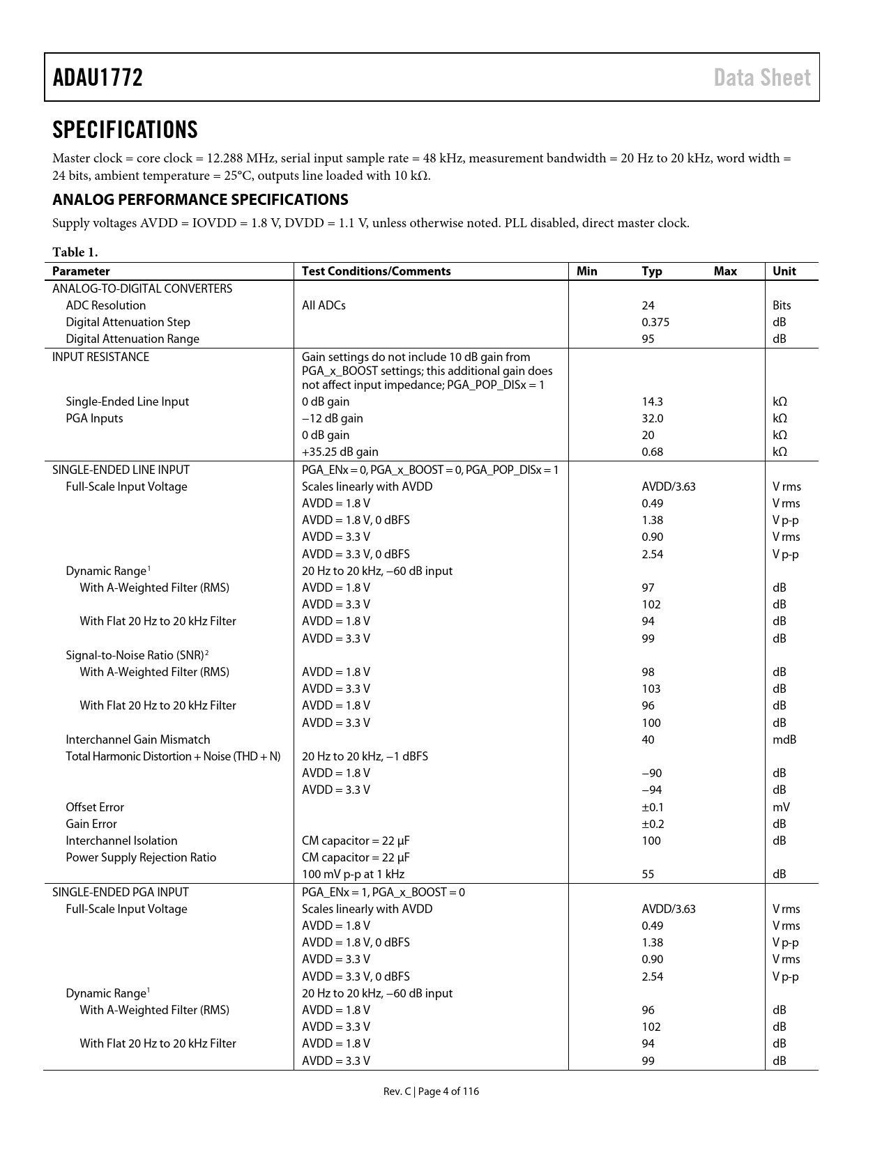 link to page 7 link to page 7 link to page 7 ADAU1772Data SheetSPECIFICATIONS Master clock = core clock = 12.288 MHz, serial input sample rate = 48 kHz, measurement bandwidth = 20 Hz to 20 kHz, word width = 24 bits, ambient temperature = 25°C, outputs line loaded with 10 kΩ. ANALOG PERFORMANCE SPECIFICATIONS Supply voltages AVDD = IOVDD = 1.8 V, DVDD = 1.1 V, unless otherwise noted. PLL disabled, direct master clock. Table 1. ParameterTest Conditions/CommentsMinTypMaxUnit ANALOG-TO-DIGITAL CONVERTERS ADC Resolution All ADCs 24 Bits Digital Attenuation Step 0.375 dB Digital Attenuation Range 95 dB INPUT RESISTANCE Gain settings do not include 10 dB gain from PGA_x_BOOST settings; this additional gain does not affect input impedance; PGA_POP_DISx = 1 Single-Ended Line Input 0 dB gain 14.3 kΩ PGA Inputs −12 dB gain 32.0 kΩ 0 dB gain 20 kΩ +35.25 dB gain 0.68 kΩ SINGLE-ENDED LINE INPUT PGA_ENx = 0, PGA_x_BOOST = 0, PGA_POP_DISx = 1 Full-Scale Input Voltage Scales linearly with AVDD AVDD/3.63 V rms AVDD = 1.8 V 0.49 V rms AVDD = 1.8 V, 0 dBFS 1.38 V p-p AVDD = 3.3 V 0.90 V rms AVDD = 3.3 V, 0 dBFS 2.54 V p-p Dynamic Range1 20 Hz to 20 kHz, −60 dB input With A-Weighted Filter (RMS) AVDD = 1.8 V 97 dB AVDD = 3.3 V 102 dB With Flat 20 Hz to 20 kHz Filter AVDD = 1.8 V 94 dB AVDD = 3.3 V 99 dB Signal-to-Noise Ratio (SNR)2 With A-Weighted Filter (RMS) AVDD = 1.8 V 98 dB AVDD = 3.3 V 103 dB With Flat 20 Hz to 20 kHz Filter AVDD = 1.8 V 96 dB AVDD = 3.3 V 100 dB Interchannel Gain Mismatch 40 mdB Total Harmonic Distortion + Noise (THD + N) 20 Hz to 20 kHz, −1 dBFS AVDD = 1.8 V −90 dB AVDD = 3.3 V −94 dB Offset Error ±0.1 mV Gain Error ±0.2 dB Interchannel Isolation CM capacitor = 22 μF 100 dB Power Supply Rejection Ratio CM capacitor = 22 μF 100 mV p-p at 1 kHz 55 dB SINGLE-ENDED PGA INPUT PGA_ENx = 1, PGA_x_BOOST = 0 Full-Scale Input Voltage Scales linearly with AVDD AVDD/3.63 V rms AVDD = 1.8 V 0.49 V rms AVDD = 1.8 V, 0 dBFS 1.38 V p-p AVDD = 3.3 V 0.90 V rms AVDD = 3.3 V, 0 dBFS 2.54 V p-p Dynamic Range1 20 Hz to 20 kHz, −60 dB input With A-Weighted Filter (RMS) AVDD = 1.8 V 96 dB AVDD = 3.3 V 102 dB With Flat 20 Hz to 20 kHz Filter AVDD = 1.8 V 94 dB AVDD = 3.3 V 99 dB Rev. C | Page 4 of 116 Document Outline Features Applications General Description Functional Block Diagram Revision History Specifications Analog Performance Specifications Crystal Amplifier Specifications Digital Input/Output Specifications Power Supply Specifications Typical Power Consumption Digital Filters Digital Timing Specifications Digital Timing Diagrams Absolute Maximum Ratings Thermal Resistance ESD Caution Pin Configuration and Function Descriptions Typical Performance Characteristics System Block Diagrams Theory of Operation System Clocking and Power-Up Clock Initialization PLL Bypass Setup PLL Enabled Setup Control Port Access During Initialization PLL Input Clock Divider Integer Mode Fractional Mode Clock Output Power Sequencing Power-Down Considerations Signal Routing Input Signal Paths Analog Inputs Signal Polarity Input Impedance Analog Microphone Inputs Analog Line Inputs Precharging Input Capacitors Microphone Bias Digital Microphone Input Analog-to-Digital Converters ADC Full-Scale Level Digital ADC Volume Control High-Pass Filter Output Signal Paths Analog Outputs Headphone Output Headphone Output Power-Up Sequencing Ground-Centered Headphone Configuration Pop-and-Click Suppression Line Outputs Digital-to-Analog Converters DAC Full-Scale Level Digital DAC Volume Control PDM Output Asynchronous Sample Rate Converters Signal Levels Signal Processing Instructions Data Memory Parameters Control Port Burst Mode Communication I2C Port Addressing I2C Read and Write Operations SPI Port Read/Write Subaddress Data Bytes Self-Boot EEPROM Size CRC Delay Boot Time Multipurpose Pins Push-Button Volume Controls Limiter Compression Enable Parameter Bank Switching Mute DSP Bypass Mode Serial Data Input/Output Ports Tristating Unused Channels Applications Information Power Supply Bypass Capacitors Layout Grounding Exposed Pad PCB Design Register Summary Register Details Clock Control Register PLL Denominator MSB Register PLL Denominator LSB Register PLL Numerator MSB Register PLL Numerator LSB Register PLL Integer Setting Register PLL Lock Flag Register CLKOUT Setting Selection Register Regulator Control Register Core Control Register Filter Engine and Limiter Control Register DB Value Register 0 Read DB Value Register 1 Read DB Value Register 2 Read Core Channel 0/Core Channel 1 Input Select Register Core Channel 2/Core Channel 3 Input Select Register DAC Input Select Register PDM Modulator Input Select Register Serial Data Output 0/Serial Data Output 1 Input Select Register Serial Data Output 2/Serial Data Output 3 Input Select Register Serial Data Output 4/Serial Data Output 5 Input Select Register Serial Data Output 6/Serial Data Output 7 Input Select Register ADC_SDATA0/ADC_SDATA1 Channel Select Register Output ASRC0/Output ASRC1 Source Register Output ASRC2/Output ASRC3 Source Register Input ASRC Channel Select Register ADC0/ADC1 Control 0 Register ADC2/ADC3 Control 0 Register ADC0/ADC1 Control 1 Register ADC2/ADC3 Control 1 Register ADC0 Volume Control Register ADC1 Volume Control Register ADC2 Volume Control Register ADC3 Volume Control Register PGA Control 0 Register PGA Control 1 Register PGA Control 2 Register PGA Control 3 Register PGA Slew Control Register PGA 10 dB Gain Boost Register Input and Output Capacitor Charging Register DSP Bypass Path Register DSP Bypass Gain for PGA0 Register DSP Bypass Gain for PGA1 Register MIC_BIAS0_1 Control Register DAC Control Register DAC0 Volume Control Register DAC1 Volume Control Register Headphone Output Mutes Register Serial Port Control 0 Register Serial Port Control 1 Register TDM Output Channel Disable Register PDM Enable Register PDM Pattern Setting Register MP0 Function Setting Register MP1 Function Setting Register MP2 Function Setting Register MP