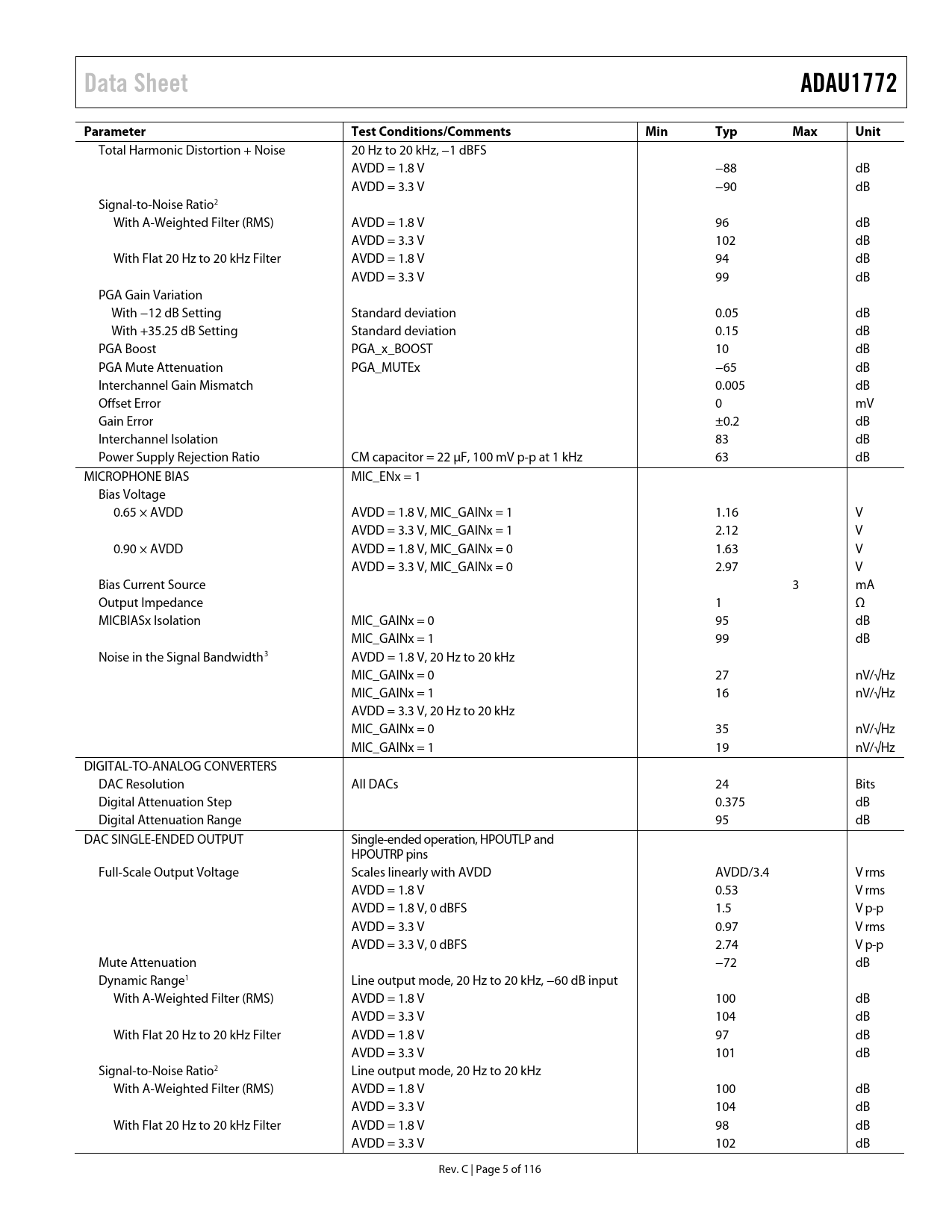 Seiten / Seite116 / 5 — Data Sheet. ADAU1772. Parameter. Test Conditions/Comments. Min. Typ. Max. …