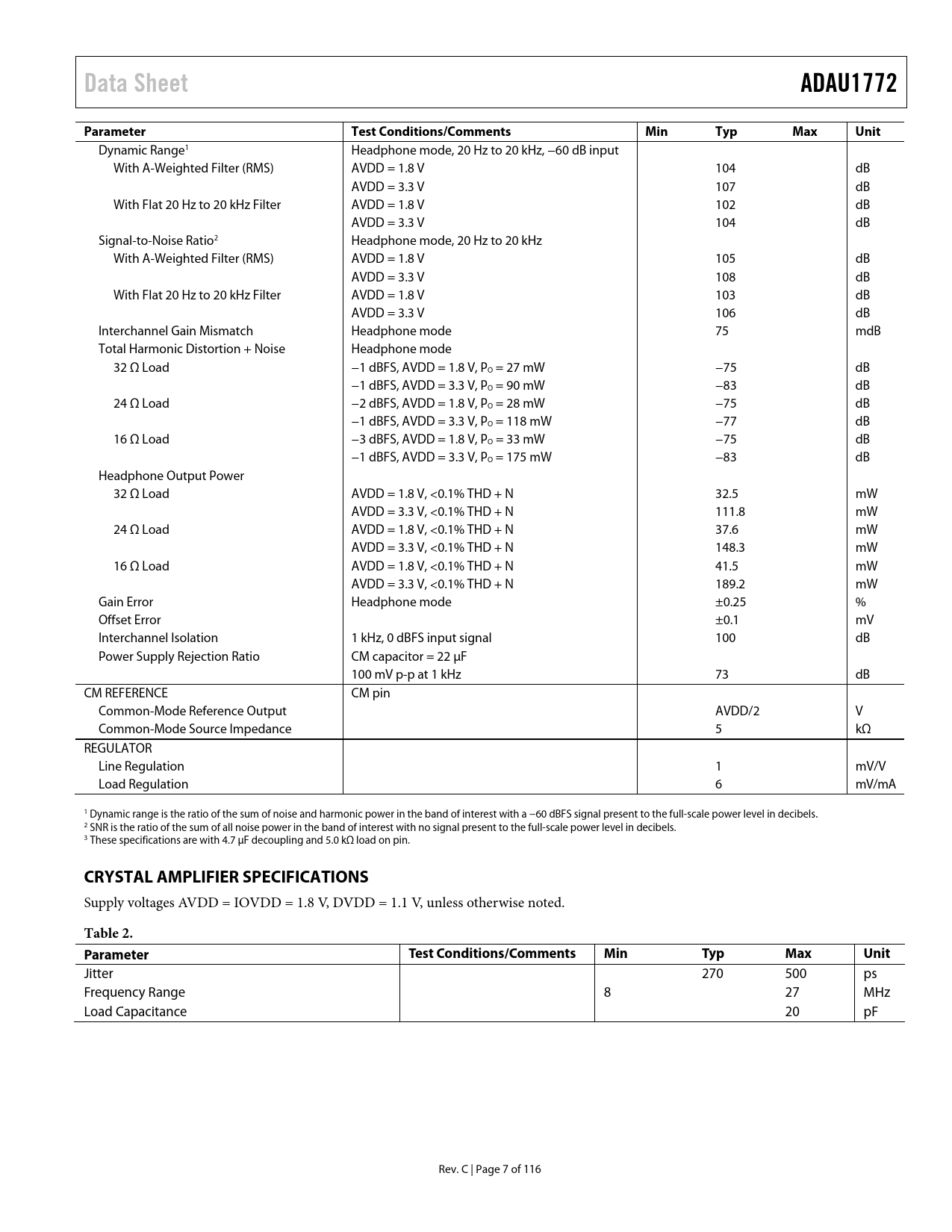 Data Sheet. ADAU1772. Parameter. Test Conditions/Comments. Min. Typ. Max. Unit. CRYSTAL AMPLIFIER SPECIFICATIONS. Table 2. Parameter