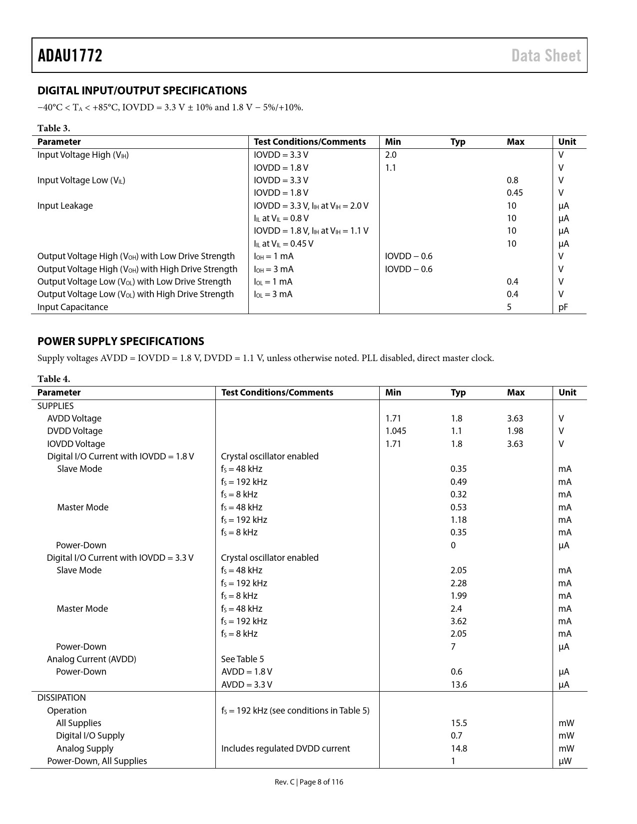 link to page 9 link to page 9 ADAU1772Data SheetDIGITAL INPUT/OUTPUT SPECIFICATIONS −40°C < TA < +85°C, IOVDD = 3.3 V ± 10% and 1.8 V − 5%/+10%. Table 3. ParameterTest Conditions/CommentsMinTypMaxUnit Input Voltage High (VIH) IOVDD = 3.3 V 2.0 V IOVDD = 1.8 V 1.1 V Input Voltage Low (VIL) IOVDD = 3.3 V 0.8 V IOVDD = 1.8 V 0.45 V Input Leakage IOVDD = 3.3 V, IIH at VIH = 2.0 V 10 µA IIL at VIL = 0.8 V 10 µA IOVDD = 1.8 V, IIH at VIH = 1.1 V 10 µA IIL at VIL = 0.45 V 10 µA Output Voltage High (VOH) with Low Drive Strength IOH = 1 mA IOVDD − 0.6 V Output Voltage High (VOH) with High Drive Strength IOH = 3 mA IOVDD − 0.6 V Output Voltage Low (VOL) with Low Drive Strength IOL = 1 mA 0.4 V Output Voltage Low (VOL) with High Drive Strength IOL = 3 mA 0.4 V Input Capacitance 5 pF POWER SUPPLY SPECIFICATIONS Supply voltages AVDD = IOVDD = 1.8 V, DVDD = 1.1 V, unless otherwise noted. PLL disabled, direct master clock. Table 4. ParameterTest Conditions/CommentsMinTypMaxUnit SUPPLIES AVDD Voltage 1.71 1.8 3.63 V DVDD Voltage 1.045 1.1 1.98 V IOVDD Voltage 1.71 1.8 3.63 V Digital I/O Current with IOVDD = 1.8 V Crystal oscillator enabled Slave Mode fS = 48 kHz 0.35 mA fS = 192 kHz 0.49 mA fS = 8 kHz 0.32 mA Master Mode fS = 48 kHz 0.53 mA fS = 192 kHz 1.18 mA fS = 8 kHz 0.35 mA Power-Down 0 µA Digital I/O Current with IOVDD = 3.3 V Crystal oscillator enabled Slave Mode fS = 48 kHz 2.05 mA fS = 192 kHz 2.28 mA fS = 8 kHz 1.99 mA Master Mode fS = 48 kHz 2.4 mA fS = 192 kHz 3.62 mA fS = 8 kHz 2.05 mA Power-Down 7 µA Analog Current (AVDD) See Table 5 Power-Down AVDD = 1.8 V 0.6 µA AVDD = 3.3 V 13.6 µA DISSIPATION Operation fS = 192 kHz (see conditions in Table 5) All Supplies 15.5 mW Digital I/O Supply 0.7 mW Analog Supply Includes regulated DVDD current 14.8 mW Power-Down, All Supplies 1 µW Rev. C | Page 8 of 116 Document Outline Features Applications General Description Functional Block Diagram Revision History Specifications Analog Performance Specifications Crystal Amplifier Specifications Digital Input/Output Specifications Power Supply Specifications Typical Power Consumption Digital Filters Digital Timing Specifications Digital Timing Diagrams Absolute Maximum Ratings Thermal Resistance ESD Caution Pin Configuration and Function Descriptions Typical Performance Characteristics System Block Diagrams Theory of Operation System Clocking and Power-Up Clock Initialization PLL Bypass Setup PLL Enabled Setup Control Port Access During Initialization PLL Input Clock Divider Integer Mode Fractional Mode Clock Output Power Sequencing Power-Down Considerations Signal Routing Input Signal Paths Analog Inputs Signal Polarity Input Impedance Analog Microphone Inputs Analog Line Inputs Precharging Input Capacitors Microphone Bias Digital Microphone Input Analog-to-Digital Converters ADC Full-Scale Level Digital ADC Volume Control High-Pass Filter Output Signal Paths Analog Outputs Headphone Output Headphone Output Power-Up Sequencing Ground-Centered Headphone Configuration Pop-and-Click Suppression Line Outputs Digital-to-Analog Converters DAC Full-Scale Level Digital DAC Volume Control PDM Output Asynchronous Sample Rate Converters Signal Levels Signal Processing Instructions Data Memory Parameters Control Port Burst Mode Communication I2C Port Addressing I2C Read and Write Operations SPI Port Read/Write Subaddress Data Bytes Self-Boot EEPROM Size CRC Delay Boot Time Multipurpose Pins Push-Button Volume Controls Limiter Compression Enable Parameter Bank Switching Mute DSP Bypass Mode Serial Data Input/Output Ports Tristating Unused Channels Applications Information Power Supply Bypass Capacitors Layout Grounding Exposed Pad PCB Design Register Summary Register Details Clock Control Register PLL Denominator MSB Register PLL Denominator LSB Register PLL Numerator MSB Register PLL Numerator LSB Register PLL Integer Setting Register PLL Lock Flag Register CLKOUT Setting Selection Register Regulator Control Register Core Control Register Filter Engine and Limiter Control Register DB Value Register 0 Read DB Value Register 1 Read DB Value Register 2 Read Core Channel 0/Core Channel 1 Input Select Register Core Channel 2/Core Channel 3 Input Select Register DAC Input Select Register PDM Modulator Input Select Register Serial Data Output 0/Serial Data Output 1 Input Select Register Serial Data Output 2/Serial Data Output 3 Input Select Register Serial Data Output 4/Serial Data Output 5 Input Select Register Serial Data Output 6/Serial Data Output 7 Input Select Register ADC_SDATA0/ADC_SDATA1 Channel Select Register Output ASRC0/Output ASRC1 Source Register Output ASRC2/Output ASRC3 Source Register Input ASRC Channel Select Register ADC0/ADC1 Control 0 Register ADC2/ADC3 Control 0 Register ADC0/ADC1 Control 1 Register ADC2/ADC3 Control 1 Register ADC0 Volume Control Register ADC1 Volume Control Register ADC2 Volume Control Register ADC3 Volume Control Register PGA Control 0 Register PGA Control 1 Register PGA Control 2 Register PGA Control 3 Register PGA Slew Control Register PGA 10 dB Gain Boost Register Input and Output Capacitor Charging Register DSP Bypass Path Register DSP Bypass Gain for PGA0 Register DSP Bypass Gain for PGA1 Register MIC_BIAS0_1 Control Register DAC Control Register DAC0 Volume Control Register DAC1 Volume Control Register Headphone Output Mutes Register Serial Port Control 0 Register Serial Port Control 1 Register TDM Output Channel Disable Register PDM Enable Register PDM Pattern Setting Register MP0 Function Setting Register MP1 Function Setting Register MP2 Function Setting Register MP3 Function Setting Register MP4 Function Setting Register MP5 Function Setting Register MP6 Function Setting Register Push-Button Volume Settings Register Push-Button Volume Control Assignment Register Debounce Modes Register Headphone Line Output Select Register Decimator Power Control Register ASRC Interpolator and DAC Modulator Power Control Register Analog Bias Control 0 Register Analog Bi