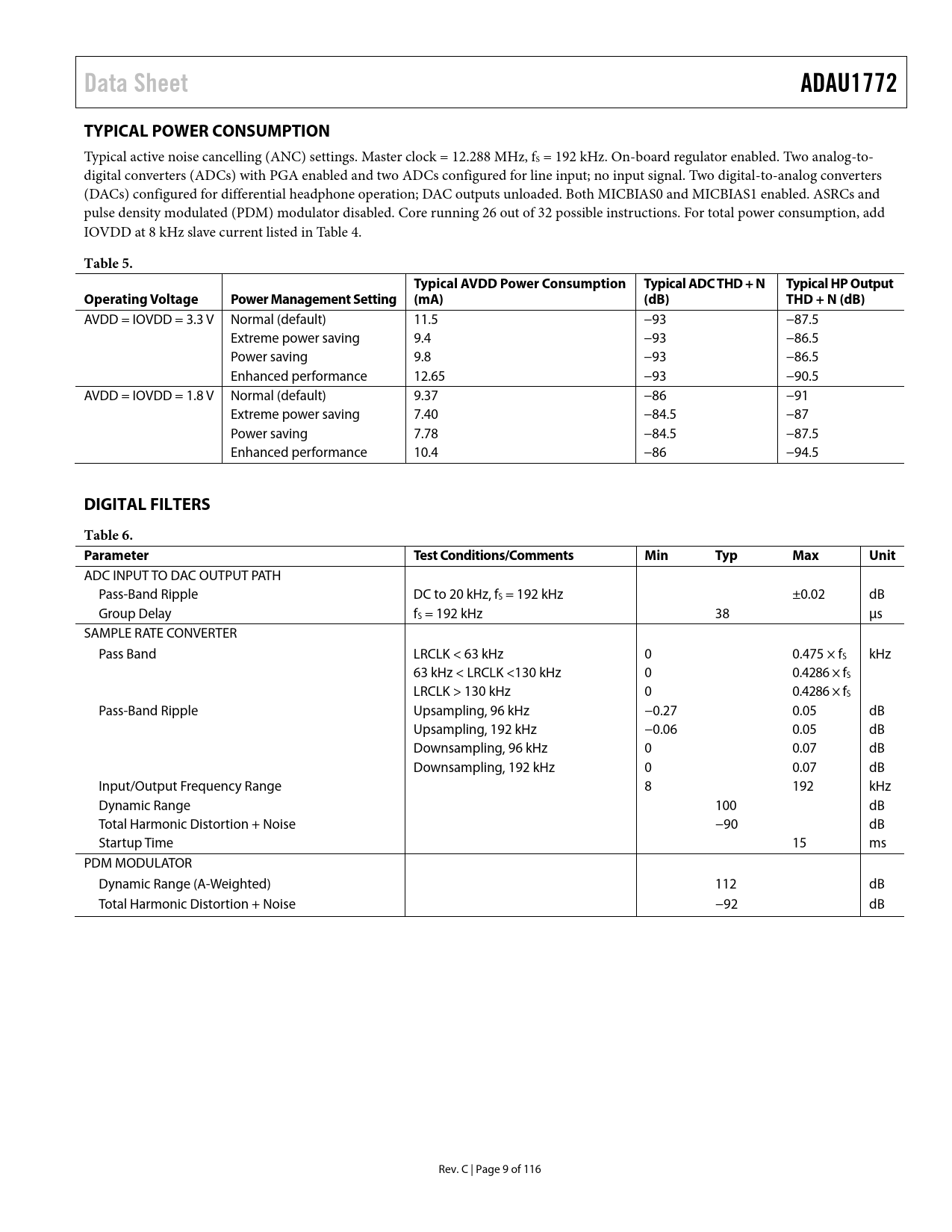 link to page 8 Data SheetADAU1772TYPICAL POWER CONSUMPTION Typical active noise cancelling (ANC) settings. Master clock = 12.288 MHz, fS = 192 kHz. On-board regulator enabled. Two analog-to- digital converters (ADCs) with PGA enabled and two ADCs configured for line input; no input signal. Two digital-to-analog converters (DACs) configured for differential headphone operation; DAC outputs unloaded. Both MICBIAS0 and MICBIAS1 enabled. ASRCs and pulse density modulated (PDM) modulator disabled. Core running 26 out of 32 possible instructions. For total power consumption, add IOVDD at 8 kHz slave current listed in Table 4. Table 5.Typical AVDD Power Consumption Typical ADC THD + NTypical HP OutputOperating VoltagePower Management Setting (mA)(dB)THD + N (dB) AVDD = IOVDD = 3.3 V Normal (default) 11.5 −93 −87.5 Extreme power saving 9.4 −93 −86.5 Power saving 9.8 −93 −86.5 Enhanced performance 12.65 −93 −90.5 AVDD = IOVDD = 1.8 V Normal (default) 9.37 −86 −91 Extreme power saving 7.40 −84.5 −87 Power saving 7.78 −84.5 −87.5 Enhanced performance 10.4 −86 −94.5 DIGITAL FILTERSTable 6. ParameterTest Conditions/CommentsMinTypMaxUnit ADC INPUT TO DAC OUTPUT PATH Pass-Band Ripple DC to 20 kHz, fS = 192 kHz ±0.02 dB Group Delay fS = 192 kHz 38 µs SAMPLE RATE CONVERTER Pass Band LRCLK < 63 kHz 0 0.475 × fS kHz 63 kHz < LRCLK <130 kHz 0 0.4286 × fS LRCLK > 130 kHz 0 0.4286 × fS Pass-Band Ripple Upsampling, 96 kHz −0.27 0.05 dB Upsampling, 192 kHz −0.06 0.05 dB Downsampling, 96 kHz 0 0.07 dB Downsampling, 192 kHz 0 0.07 dB Input/Output Frequency Range 8 192 kHz Dynamic Range 100 dB Total Harmonic Distortion + Noise −90 dB Startup Time 15 ms PDM MODULATOR Dynamic Range (A-Weighted) 112 dB Total Harmonic Distortion + Noise −92 dB Rev. C | Page 9 of 116 Document Outline Features Applications General Description Functional Block Diagram Revision History Specifications Analog Performance Specifications Crystal Amplifier Specifications Digital Input/Output Specifications Power Supply Specifications Typical Power Consumption Digital Filters Digital Timing Specifications Digital Timing Diagrams Absolute Maximum Ratings Thermal Resistance ESD Caution Pin Configuration and Function Descriptions Typical Performance Characteristics System Block Diagrams Theory of Operation System Clocking and Power-Up Clock Initialization PLL Bypass Setup PLL Enabled Setup Control Port Access During Initialization PLL Input Clock Divider Integer Mode Fractional Mode Clock Output Power Sequencing Power-Down Considerations Signal Routing Input Signal Paths Analog Inputs Signal Polarity Input Impedance Analog Microphone Inputs Analog Line Inputs Precharging Input Capacitors Microphone Bias Digital Microphone Input Analog-to-Digital Converters ADC Full-Scale Level Digital ADC Volume Control High-Pass Filter Output Signal Paths Analog Outputs Headphone Output Headphone Output Power-Up Sequencing Ground-Centered Headphone Configuration Pop-and-Click Suppression Line Outputs Digital-to-Analog Converters DAC Full-Scale Level Digital DAC Volume Control PDM Output Asynchronous Sample Rate Converters Signal Levels Signal Processing Instructions Data Memory Parameters Control Port Burst Mode Communication I2C Port Addressing I2C Read and Write Operations SPI Port Read/Write Subaddress Data Bytes Self-Boot EEPROM Size CRC Delay Boot Time Multipurpose Pins Push-Button Volume Controls Limiter Compression Enable Parameter Bank Switching Mute DSP Bypass Mode Serial Data Input/Output Ports Tristating Unused Channels Applications Information Power Supply Bypass Capacitors Layout Grounding Exposed Pad PCB Design Register Summary Register Details Clock Control Register PLL Denominator MSB Register PLL Denominator LSB Register PLL Numerator MSB Register PLL Numerator LSB Register PLL Integer Setting Register PLL Lock Flag Register CLKOUT Setting Selection Register Regulator Control Register Core Control Register Filter Engine and Limiter Control Register DB Value Register 0 Read DB Value Register 1 Read DB Value Register 2 Read Core Channel 0/Core Channel 1 Input Select Register Core Channel 2/Core Channel 3 Input Select Register DAC Input Select Register PDM Modulator Input Select Register Serial Data Output 0/Serial Data Output 1 Input Select Register Serial Data Output 2/Serial Data Output 3 Input Select Register Serial Data Output 4/Serial Data Output 5 Input Select Register Serial Data Output 6/Serial Data Output 7 Input Select Register ADC_SDATA0/ADC_SDATA1 Channel Select Register Output ASRC0/Output ASRC1 Source Register Output ASRC2/Output ASRC3 Source Register Input ASRC Channel Select Register ADC0/ADC1 Control 0 Register ADC2/ADC3 Control 0 Register ADC0/ADC1 Control 1 Register ADC2/ADC3 Control 1 Register ADC0 Volume Control Register ADC1 Volume Control Register ADC2 Volume Control Register ADC3 Volume Control Register PGA Control 0 Register PGA Control 1 Register PGA Control 2 Register PGA Control 3 Register PGA Slew Control Register PGA 10 dB Gain Boost Register Input and Output Capacitor Charging Register DSP Bypass Path Register DSP Bypass Gain for PGA0 Register DSP Bypass Gain for PGA1 Register MIC_BIAS0_1 Control Register DAC Control Register DAC0 Volume Control Register DAC1 Volume Control Register Headphone Output Mutes Register Serial Port Control 0 Register Serial Port Control 1 Register TDM Output Channel Disable Register PDM Enable Register PDM Pattern Setting Register MP0 Function Setting Register MP1 Function Setting Register MP2 Function Setting Register MP3 Function Setting Register MP4 Function Setting Register MP5 Function Setting Register MP6 Function Setting Register Push-Button Volume Settings Register Push-Button Volume Control Assignment Register Debounce Modes Register Headphone Line Output Select Register Decimator Power Control Register ASRC Interpolator and DAC Modulator Power Control Register Analog Bias Control 0 Register Analog Bias Control 1 Register Digital Pin Pul