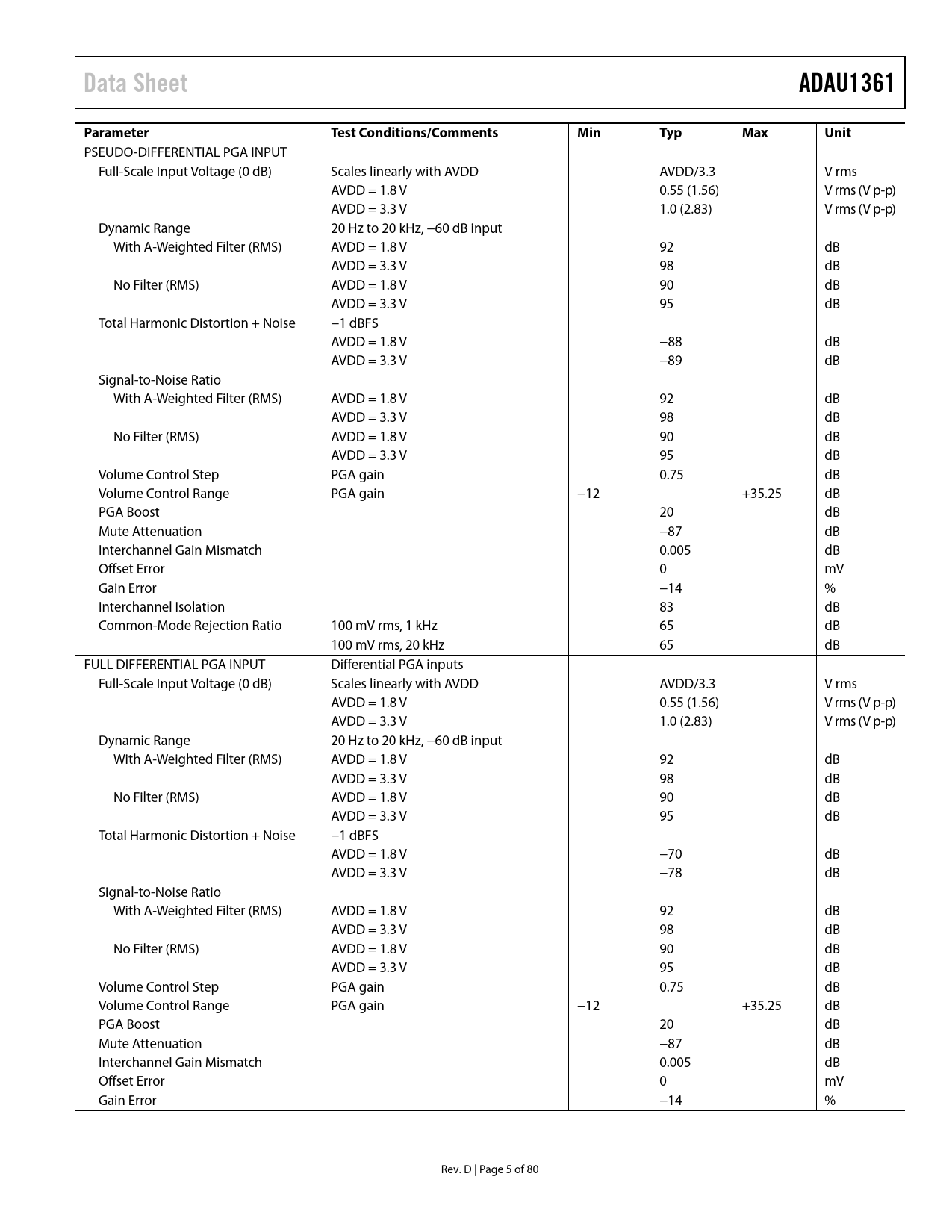 Data SheetADAU1361ParameterTest Conditions/CommentsMinTypMaxUnit PSEUDO-DIFFERENTIAL PGA INPUT Full-Scale Input Voltage (0 dB) Scales linearly with AVDD AVDD/3.3 V rms AVDD = 1.8 V 0.55 (1.56) V rms (V p-p) AVDD = 3.3 V 1.0 (2.83) V rms (V p-p) Dynamic Range 20 Hz to 20 kHz, −60 dB input With A-Weighted Filter (RMS) AVDD = 1.8 V 92 dB AVDD = 3.3 V 98 dB No Filter (RMS) AVDD = 1.8 V 90 dB AVDD = 3.3 V 95 dB Total Harmonic Distortion + Noise −1 dBFS AVDD = 1.8 V −88 dB AVDD = 3.3 V −89 dB Signal-to-Noise Ratio With A-Weighted Filter (RMS) AVDD = 1.8 V 92 dB AVDD = 3.3 V 98 dB No Filter (RMS) AVDD = 1.8 V 90 dB AVDD = 3.3 V 95 dB Volume Control Step PGA gain 0.75 dB Volume Control Range PGA gain −12 +35.25 dB PGA Boost 20 dB Mute Attenuation −87 dB Interchannel Gain Mismatch 0.005 dB Offset Error 0 mV Gain Error −14 % Interchannel Isolation 83 dB Common-Mode Rejection Ratio 100 mV rms, 1 kHz 65 dB 100 mV rms, 20 kHz 65 dB FULL DIFFERENTIAL PGA INPUT Differential PGA inputs Full-Scale Input Voltage (0 dB) Scales linearly with AVDD AVDD/3.3 V rms AVDD = 1.8 V 0.55 (1.56) V rms (V p-p) AVDD = 3.3 V 1.0 (2.83) V rms (V p-p) Dynamic Range 20 Hz to 20 kHz, −60 dB input With A-Weighted Filter (RMS) AVDD = 1.8 V 92 dB AVDD = 3.3 V 98 dB No Filter (RMS) AVDD = 1.8 V 90 dB AVDD = 3.3 V 95 dB Total Harmonic Distortion + Noise −1 dBFS AVDD = 1.8 V −70 dB AVDD = 3.3 V −78 dB Signal-to-Noise Ratio With A-Weighted Filter (RMS) AVDD = 1.8 V 92 dB AVDD = 3.3 V 98 dB No Filter (RMS) AVDD = 1.8 V 90 dB AVDD = 3.3 V 95 dB Volume Control Step PGA gain 0.75 dB Volume Control Range PGA gain −12 +35.25 dB PGA Boost 20 dB Mute Attenuation −87 dB Interchannel Gain Mismatch 0.005 dB Offset Error 0 mV Gain Error −14 % Rev. D | Page 5 of 80 Document Outline Features Applications General Description Functional Block Diagram Revision History Specifications Analog Performance Specifications Power Supply Specifications Typical Current Consumption Typical Power Management Measurements Digital Filters Digital Input/Output Specifications Digital Timing Specifications Digital Timing Diagrams Absolute Maximum Ratings Thermal Resistance ESD Caution Pin Configuration and Function Descriptions Typical Performance Characteristics System Block Diagrams Theory of Operation Startup, Initialization, and Power Power-Up Sequence Power Reduction Modes Digital Power Supply Input/Output Power Supply Clock Generation and Management Case 1: PLL Is Bypassed Case 2: PLL Is Used PLL Lock Acquisition Clocking and Sampling Rates Core Clock Sampling Rates PLL Integer Mode Fractional Mode Record Signal Path Input Signal Paths Analog Microphone Inputs Analog Line Inputs Digital Microphone Input Microphone Bias Analog-to-Digital Converters ADC Full-Scale Level Digital ADC Volume Control High-Pass Filter Automatic Level Control (ALC) ALC Parameters Noise Gate Function Playback Signal Path Output Signal Paths Routing Flexibility Headphone Output Capless Headphone Configuration Headphone Output Power-Up/Power-Down Sequencing Ground-Centered Headphone Configuration Jack Detection Pop-and-Click Suppression Line Outputs Control Ports Burst Mode Writing and Reading I2C Port Addressing I2C Read and Write Operations SPI Port Chip Address R/ Subaddress Data Bytes Serial Data Input/Output Ports Applications Information Power Supply Bypass Capacitors GSM Noise Filter Grounding Exposed Pad PCB Design Control Registers Control Register Details R0: Clock Control, 16,384 (0x4000) R1: PLL Control, 16,386 (0x4002) R2: Digital Microphone/Jack Detection Control, 16,392 (0x4008) R3: Record Power Management, 16,393 (0x4009) R4: Record Mixer Left (Mixer 1) Control 0, 16,394 (0x400A) R5: Record Mixer Left (Mixer 1) Control 1, 16,395 (0x400B) R6: Record Mixer Right (Mixer 2) Control 0, 16,396 (0x400C) R7: Record Mixer Right (Mixer 2) Control 1, 16,397 (0x400D) R8: Left Differential Input Volume Control, 16,398 (0x400E) R9: Right Differential Input Volume Control, 16,399 (0x400F) R10: Record Microphone Bias Control, 16,400 (0x4010) R11: ALC Control 0, 16,401 (0x4011) R12: ALC Control 1, 16,402 (0x4012) R13: ALC Control 2, 16,403 (0x4013) R14: ALC Control 3, 16,404 (0x4014) R15: Serial Port Control 0, 16,405 (0x4015) R16: Serial Port Control 1, 16,406 (0x4016) R17: Converter Control 0, 16,407 (0x4017) R18: Converter Control 1, 16,408 (0x4018) R19: ADC Control, 16,409 (0x4019) R20: Left Input Digital Volume, 16,410 (0x401A) R21: Right Input Digital Volume, 16,411 (0x401B) R22: Playback Mixer Left (Mixer 3) Control 0, 16,412 (0x401C) R23: Playback Mixer Left (Mixer 3) Control 1, 16,413 (0x401D) R24: Playback Mixer Right (Mixer 4) Control 0, 16,414 (0x401E) R25: Playback Mixer Right (Mixer 4) Control 1, 16,415 (0x401F) R26: Playback L/R Mixer Left (Mixer 5) Line Output Control, 16,416 (0x4020) R27: Playback L/R Mixer Right (Mixer 6) Line Output Control, 16,417 (0x4021) R28: Playback L/R Mixer Mono Output (Mixer 7) Control, 16,418 (0x4022) R29: Playback Headphone Left Volume Control, 16,419 (0x4023) R30: Playback Headphone Right Volume Control, 16,420 (0x4024) R31: Playback Line Output Left Volume Control, 16,421 (0x4025) R32: Playback Line Output Right Volume Control, 16,422 (0x4026) R33: Playback Mono Output Control, 16,423 (0x4027) R34: Playback Pop/Click Suppression, 16,424 (0x4028) R35: Playback Power Management, 16,425 (0x4029) R36: DAC Control 0, 16,426 (0x402A) R37: DAC Control 1, 16,427 (0x402B) R38: DAC Control 2, 16,428 (0x402C) R39: Serial Port Pad Control, 16,429 (0x402D) R40: Control Port Pad Control 0, 16,431 (0x402F) R41: Control Port Pad Control 1, 16,432 (0x4030) R42: Jack Detect Pin Control, 16,433 (0x4031) R67: Dejitter Control, 16,438 (0x4036) Outline Dimensions Ordering Guide