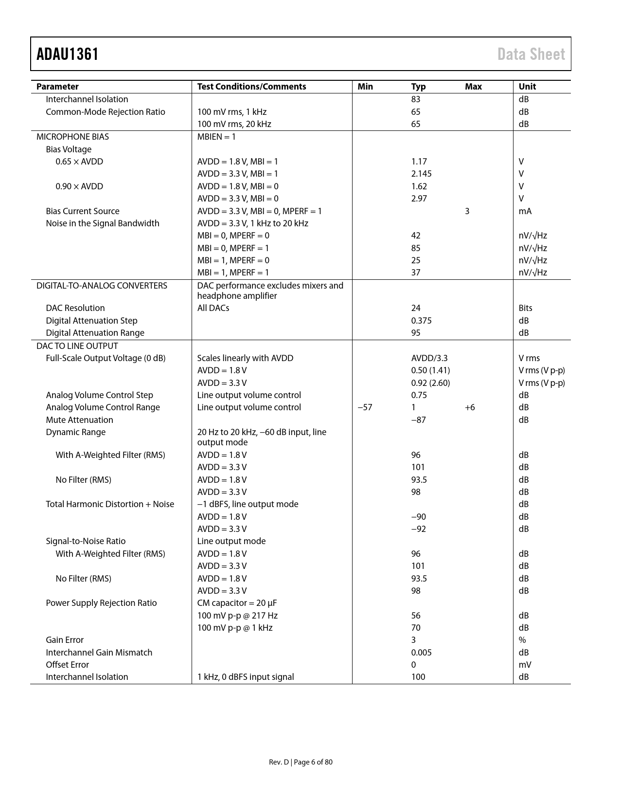 ADAU1361Data SheetParameterTest Conditions/CommentsMinTypMaxUnit Interchannel Isolation 83 dB Common-Mode Rejection Ratio 100 mV rms, 1 kHz 65 dB 100 mV rms, 20 kHz 65 dB MICROPHONE BIAS MBIEN = 1 Bias Voltage 0.65 × AVDD AVDD = 1.8 V, MBI = 1 1.17 V AVDD = 3.3 V, MBI = 1 2.145 V 0.90 × AVDD AVDD = 1.8 V, MBI = 0 1.62 V AVDD = 3.3 V, MBI = 0 2.97 V Bias Current Source AVDD = 3.3 V, MBI = 0, MPERF = 1 3 mA Noise in the Signal Bandwidth AVDD = 3.3 V, 1 kHz to 20 kHz MBI = 0, MPERF = 0 42 nV/√Hz MBI = 0, MPERF = 1 85 nV/√Hz MBI = 1, MPERF = 0 25 nV/√Hz MBI = 1, MPERF = 1 37 nV/√Hz DIGITAL-TO-ANALOG CONVERTERS DAC performance excludes mixers and headphone amplifier DAC Resolution All DACs 24 Bits Digital Attenuation Step 0.375 dB Digital Attenuation Range 95 dB DAC TO LINE OUTPUT Full-Scale Output Voltage (0 dB) Scales linearly with AVDD AVDD/3.3 V rms AVDD = 1.8 V 0.50 (1.41) V rms (V p-p) AVDD = 3.3 V 0.92 (2.60) V rms (V p-p) Analog Volume Control Step Line output volume control 0.75 dB Analog Volume Control Range Line output volume control −57 1 +6 dB Mute Attenuation −87 dB Dynamic Range 20 Hz to 20 kHz, −60 dB input, line output mode With A-Weighted Filter (RMS) AVDD = 1.8 V 96 dB AVDD = 3.3 V 101 dB No Filter (RMS) AVDD = 1.8 V 93.5 dB AVDD = 3.3 V 98 dB Total Harmonic Distortion + Noise −1 dBFS, line output mode dB AVDD = 1.8 V −90 dB AVDD = 3.3 V −92 dB Signal-to-Noise Ratio Line output mode With A-Weighted Filter (RMS) AVDD = 1.8 V 96 dB AVDD = 3.3 V 101 dB No Filter (RMS) AVDD = 1.8 V 93.5 dB AVDD = 3.3 V 98 dB Power Supply Rejection Ratio CM capacitor = 20 μF 100 mV p-p @ 217 Hz 56 dB 100 mV p-p @ 1 kHz 70 dB Gain Error 3 % Interchannel Gain Mismatch 0.005 dB Offset Error 0 mV Interchannel Isolation 1 kHz, 0 dBFS input signal 100 dB Rev. D | Page 6 of 80 Document Outline Features Applications General Description Functional Block Diagram Revision History Specifications Analog Performance Specifications Power Supply Specifications Typical Current Consumption Typical Power Management Measurements Digital Filters Digital Input/Output Specifications Digital Timing Specifications Digital Timing Diagrams Absolute Maximum Ratings Thermal Resistance ESD Caution Pin Configuration and Function Descriptions Typical Performance Characteristics System Block Diagrams Theory of Operation Startup, Initialization, and Power Power-Up Sequence Power Reduction Modes Digital Power Supply Input/Output Power Supply Clock Generation and Management Case 1: PLL Is Bypassed Case 2: PLL Is Used PLL Lock Acquisition Clocking and Sampling Rates Core Clock Sampling Rates PLL Integer Mode Fractional Mode Record Signal Path Input Signal Paths Analog Microphone Inputs Analog Line Inputs Digital Microphone Input Microphone Bias Analog-to-Digital Converters ADC Full-Scale Level Digital ADC Volume Control High-Pass Filter Automatic Level Control (ALC) ALC Parameters Noise Gate Function Playback Signal Path Output Signal Paths Routing Flexibility Headphone Output Capless Headphone Configuration Headphone Output Power-Up/Power-Down Sequencing Ground-Centered Headphone Configuration Jack Detection Pop-and-Click Suppression Line Outputs Control Ports Burst Mode Writing and Reading I2C Port Addressing I2C Read and Write Operations SPI Port Chip Address R/ Subaddress Data Bytes Serial Data Input/Output Ports Applications Information Power Supply Bypass Capacitors GSM Noise Filter Grounding Exposed Pad PCB Design Control Registers Control Register Details R0: Clock Control, 16,384 (0x4000) R1: PLL Control, 16,386 (0x4002) R2: Digital Microphone/Jack Detection Control, 16,392 (0x4008) R3: Record Power Management, 16,393 (0x4009) R4: Record Mixer Left (Mixer 1) Control 0, 16,394 (0x400A) R5: Record Mixer Left (Mixer 1) Control 1, 16,395 (0x400B) R6: Record Mixer Right (Mixer 2) Control 0, 16,396 (0x400C) R7: Record Mixer Right (Mixer 2) Control 1, 16,397 (0x400D) R8: Left Differential Input Volume Control, 16,398 (0x400E) R9: Right Differential Input Volume Control, 16,399 (0x400F) R10: Record Microphone Bias Control, 16,400 (0x4010) R11: ALC Control 0, 16,401 (0x4011) R12: ALC Control 1, 16,402 (0x4012) R13: ALC Control 2, 16,403 (0x4013) R14: ALC Control 3, 16,404 (0x4014) R15: Serial Port Control 0, 16,405 (0x4015) R16: Serial Port Control 1, 16,406 (0x4016) R17: Converter Control 0, 16,407 (0x4017) R18: Converter Control 1, 16,408 (0x4018) R19: ADC Control, 16,409 (0x4019) R20: Left Input Digital Volume, 16,410 (0x401A) R21: Right Input Digital Volume, 16,411 (0x401B) R22: Playback Mixer Left (Mixer 3) Control 0, 16,412 (0x401C) R23: Playback Mixer Left (Mixer 3) Control 1, 16,413 (0x401D) R24: Playback Mixer Right (Mixer 4) Control 0, 16,414 (0x401E) R25: Playback Mixer Right (Mixer 4) Control 1, 16,415 (0x401F) R26: Playback L/R Mixer Left (Mixer 5) Line Output Control, 16,416 (0x4020) R27: Playback L/R Mixer Right (Mixer 6) Line Output Control, 16,417 (0x4021) R28: Playback L/R Mixer Mono Output (Mixer 7) Control, 16,418 (0x4022) R29: Playback Headphone Left Volume Control, 16,419 (0x4023) R30: Playback Headphone Right Volume Control, 16,420 (0x4024) R31: Playback Line Output Left Volume Control, 16,421 (0x4025) R32: Playback Line Output Right Volume Control, 16,422 (0x4026) R33: Playback Mono Output Control, 16,423 (0x4027) R34: Playback Pop/Click Suppression, 16,424 (0x4028) R35: Playback Power Management, 16,425 (0x4029) R36: DAC Control 0, 16,426 (0x402A) R37: DAC Control 1, 16,427 (0x402B) R38: DAC Control 2, 16,428 (0x402C) R39: Serial Port Pad Control, 16,429 (0x402D) R40: Control Port Pad Control 0, 16,431 (0x402F) R41: Control Port Pad Control 1, 16,432 (0x4030) R42: Jack Detect Pin Control, 16,433 (0x4031) R67: Dejitter Control, 16,438 (0x4036) Outline Dimensions Ordering Guide