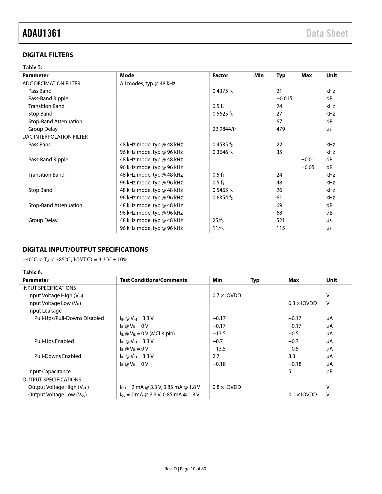 ADAU1361. Data Sheet. DIGITAL FILTERS. Table 5. Parameter. Mode. Factor. Min. Typ. Max. Unit. DIGITAL INPUT/OUTPUT SPECIFICATIONS