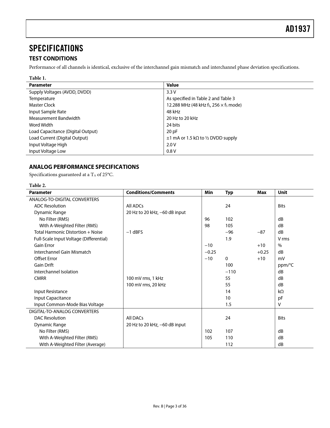 AD1937. SPECIFICATIONS TEST CONDITIONS. Table 1. Parameter Value. ANALOG PERFORMANCE SPECIFICATIONS