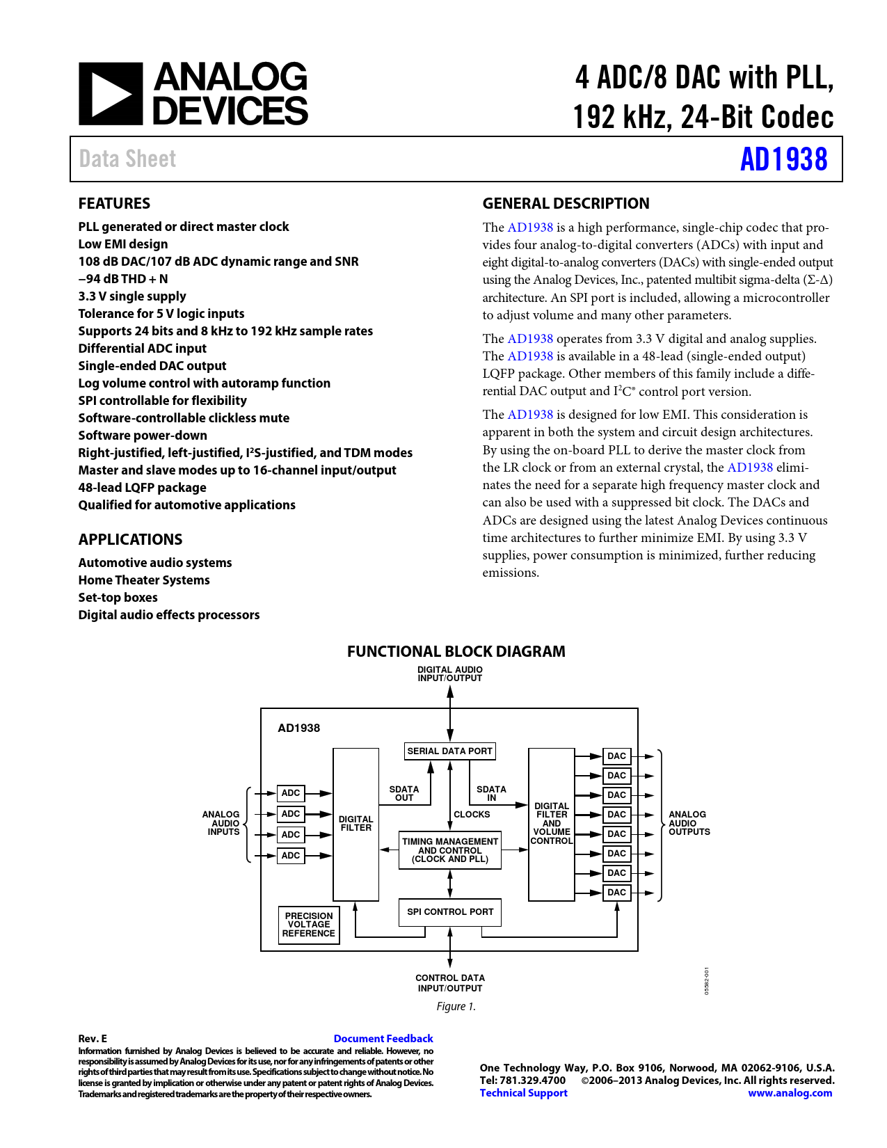 4 ADC/8 DAC with PLL,. 192 kHz, 24-Bit Codec. Data Sheet. AD1938. FEATURES. GENERAL DESCRIPTION