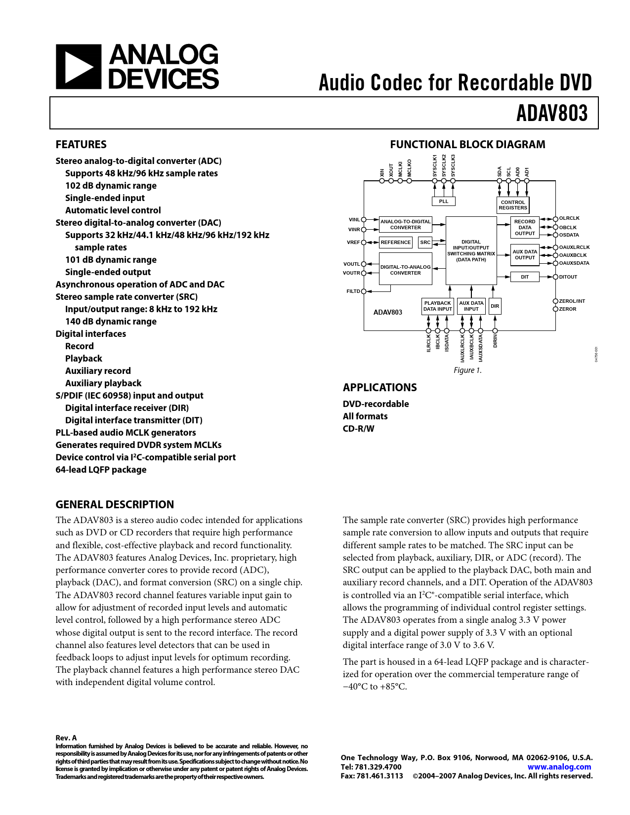 Audio Codec for Recordable DVD. ADAV803. FEATURES. FUNCTIONAL BLOCK DIAGRAM. Stereo analog-to-digital converter (ADC)