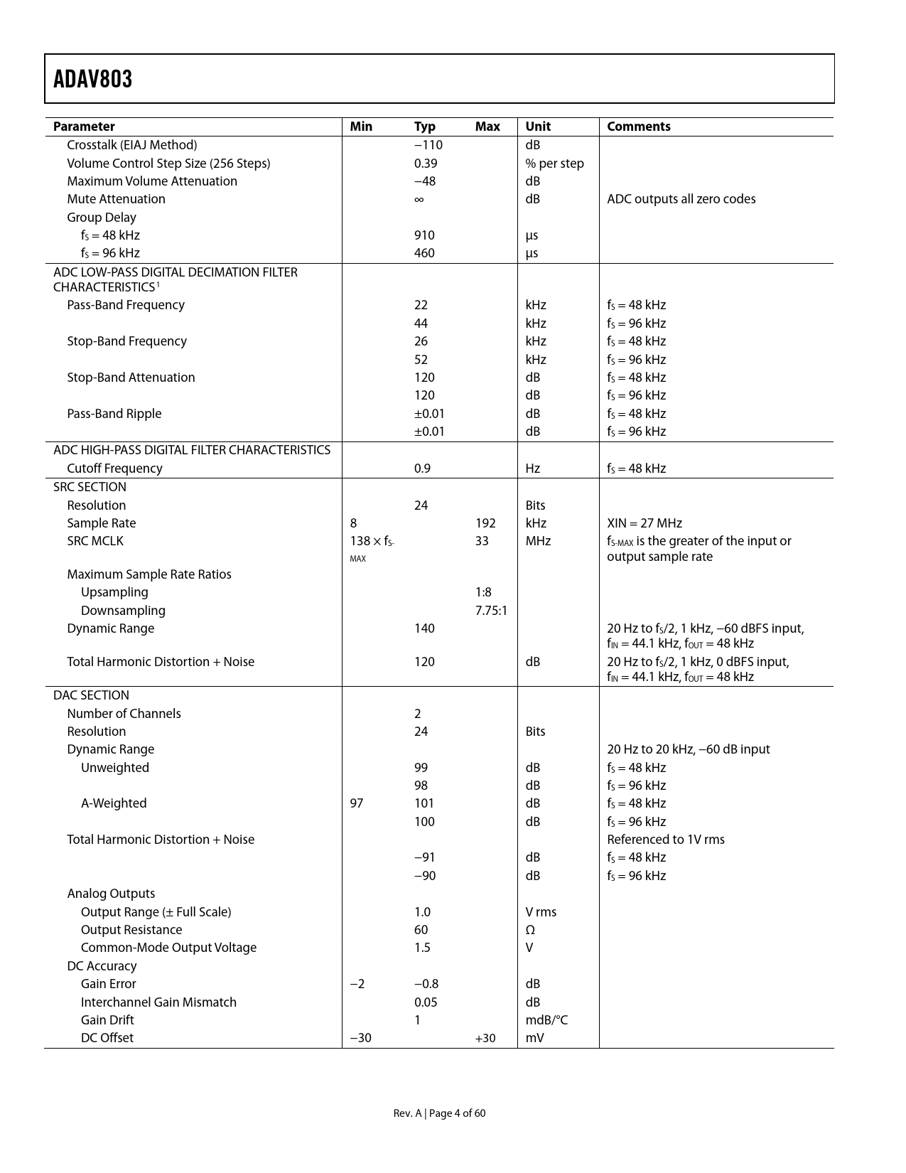 | Seiten / Seite | 60 / 4 — ADAV803. Parameter Min. Typ. Max. Unit. Comments |