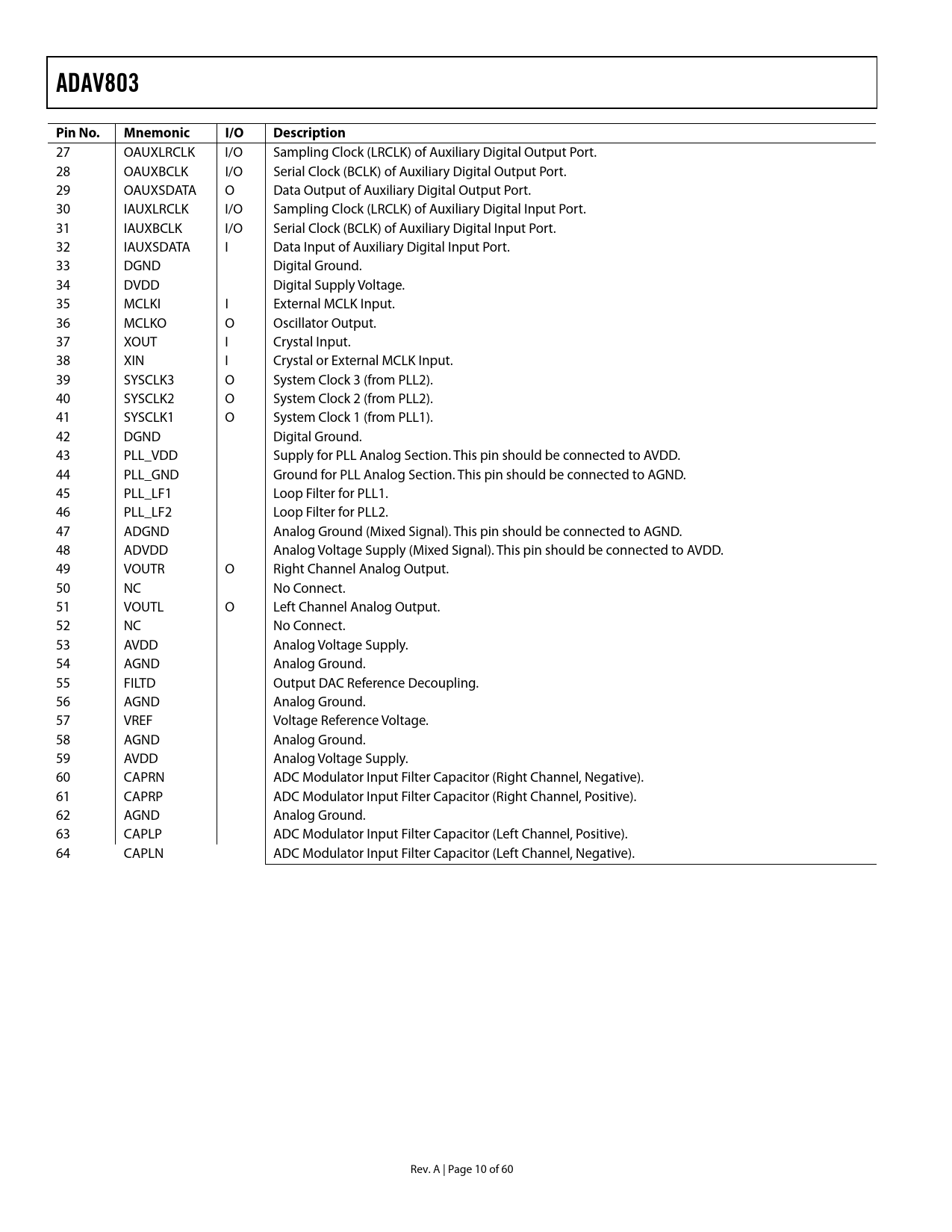 | Seiten / Seite | 60 / 10 — ADAV803. Pin No. Mnemonic. I/O. Description |