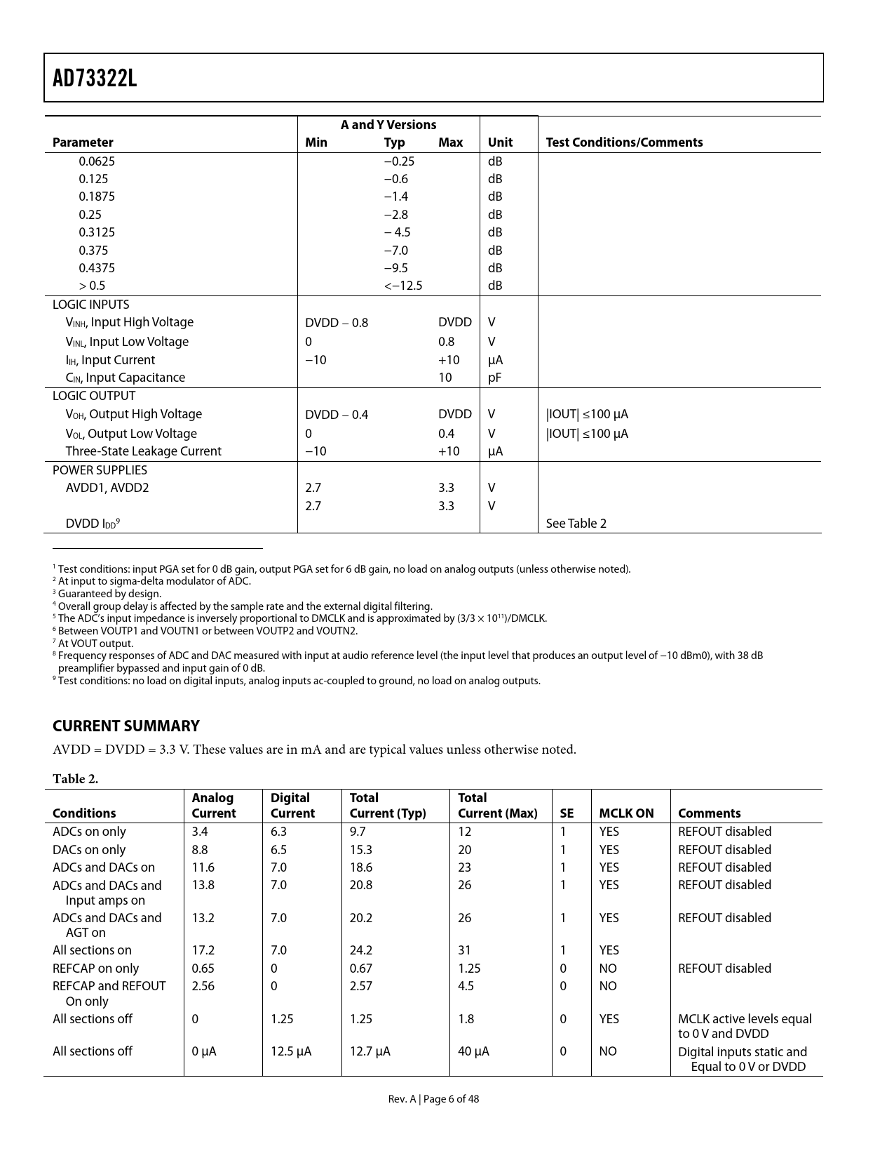 link to page 6 link to page 41 AD73322LAandYVersionsParameter MinTypMaxUnitTestConditions/Comments 0.0625 −0.25 dB 0.125 −0.6 dB 0.1875 −1.4 dB 0.25 −2.8 dB 0.3125 − 4.5 dB 0.375 −7.0 dB 0.4375 −9.5 dB > 0.5 <−12.5 dB LOGIC INPUTS VINH, Input High Voltage DVDD − 0.8 DVDD V VINL, Input Low Voltage 0 0.8 V IIH, Input Current −10 +10 µA CIN, Input Capacitance 10 pF LOGIC OUTPUT VOH, Output High Voltage DVDD − 0.4 DVDD V |IOUT| ≤100 µA VOL, Output Low Voltage 0 0.4 V |IOUT| ≤100 µA Three-State Leakage Current −10 +10 µA POWER SUPPLIES AVDD1, AVDD2 2.7 3.3 V 2.7 3.3 V DVDD I 9 DD See Table 2 1 Test conditions: input PGA set for 0 dB gain, output PGA set for 6 dB gain, no load on analog outputs (unless otherwise noted). 2 At input to sigma-delta modulator of ADC. 3 Guaranteed by design. 4 Overall group delay is affected by the sample rate and the external digital filtering. 5 The ADC’s input impedance is inversely proportional to DMCLK and is approximated by (3/3 × 1011)/DMCLK. 6 Between VOUTP1 and VOUTN1 or between VOUTP2 and VOUTN2. 7 At VOUT output. 8 Frequency responses of ADC and DAC measured with input at audio reference level (the input level that produces an output level of −10 dBm0), with 38 dB preamplifier bypassed and input gain of 0 dB. 9 Test conditions: no load on digital inputs, analog inputs ac-coupled to ground, no load on analog outputs. CURRENT SUMMARY AVDD = DVDD = 3.3 V. These values are in mA and are typical values unless otherwise noted. Table 2.AnalogDigitalTotalTotalConditionsCurrentCurrentCurrent (Typ)Current (Max)SEMCLK ONComments ADCs on only 3.4 6.3 9.7 12 1 YES REFOUT disabled DACs on only 8.8 6.5 15.3 20 1 YES REFOUT disabled ADCs and DACs on 11.6 7.0 18.6 23 1 YES REFOUT disabled ADCs and DACs and 13.8 7.0 20.8 26 1 YES REFOUT disabled Input amps on ADCs and DACs and 13.2 7.0 20.2 26 1 YES REFOUT disabled AGT on All sections on 17.2 7.0 24.2 31 1 YES REFCAP on only 0.65 0 0.67 1.25 0 NO REFOUT disabled REFCAP and REFOUT 2.56 0 2.57 4.5 0 NO On only All sections off 0 1.25 1.25 1.8 0 YES MCLK active levels equal to 0 V and DVDD All sections off 0 µA 12.5 µA 12.7 µA 40 µA 0 NO Digital inputs static and Equal to 0 V or DVDD Rev. A | Page 6 of 48 Document Outline FEATURES APPLICATIONS GENERAL DESCRIPTION FUNCTIONAL BLOCK DIAGRAM SPECIFICATIONS CURRENT SUMMARY SIGNAL RANGES TIMING CHARACTERISTICS TIMING DIAGRAMS ABSOLUTE MAXIMUM RATINGS ESD CAUTION PIN CONFIGURATIONS AND FUNCTION DESCRIPTIONS TERMINOLOGY ABBREVIATIONS TYPICAL PERFORMANCE CHARACTERISTICS AND FUNCTIONAL BLOCK DIA FUNCTIONAL DESCRIPTIONS ENCODER CHANNELS PROGRAMMABLE GAIN AMPLIFIER ADC ANALOG SIGMA-DELTA MODULATOR DECIMATION FILTER ADC CODING DECODER CHANNEL DAC CODING INTERPOLATION FILTER ANALOG SMOOTHING FILTER AND PGA DIFFERENTIAL OUTPUT AMPLIFIERS VOLTAGE REFERENCE ANALOG AND DIGITAL GAIN TAPS DIGITAL GAIN TAP SERIAL PORT (SPORT) SPORT OVERVIEW SPORT REGISTER MAPS MASTER CLOCK DIVIDER SERIAL CLOCK RATE DIVIDER SAMPLE RATE DIVIDER DAC ADVANCE REGISTER CONTROL REGISTER A CONTROL REGISTER B CONTROL REGISTER C CONTROL REGISTER D CONTROL REGISTER E CONTROL REGISTER F CONTROL REGISTER G CONTROL REGISTER H OPERATION RESETTING THE AD73322L POWER MANAGEMENT OPERATING MODES PROGRAM (CONTROL) MODE DATA MODE MIXED PROGRAM/DATA MODE DIGITAL LOOP-BACK MODE SPORT LOOP-BACK MODE ANALOG LOOP-BACK MODE INTERFACING CASCADE OPERATION PERFORMANCE ENCODER SECTION ENCODER GROUP DELAY DECODER SECTION ON-CHIP FILTERING DECODER GROUP DELAY DESIGN CONSIDERATIONS ANALOG INPUTS INTERFACING TO AN ELECTRET MICROPHONE ANALOG OUTPUT DIFFERENTIAL-TO-SINGLE-ENDED OUTPUT DIGITAL INTERFACING CASCADE OPERATION GROUNDING AND LAYOUT DSP PROGRAMMING CONSIDERATIONS DSP SPORT CONFIGURATION DSP SPORT INTERRUPTS DSP SOFTWARE CONSIDERATIONS WHEN INTERFACING TO THE AD73322L OPERATING MODE MIXED-MODE OPERATION INTERRUPTS INITIALIZATION RUNNING THE AD73322L WITH ADCS OR DACS IN POWER-DOWN DAC TIMING CONTROL EXAMPLE CONFIGURING AN AD73322L TO OPERATE IN DATA MODE CONFIGURING AN AD73322L TO OPERATE IN MIXED MODE OUTLINE DIMENSIONS ORDERING GUIDE