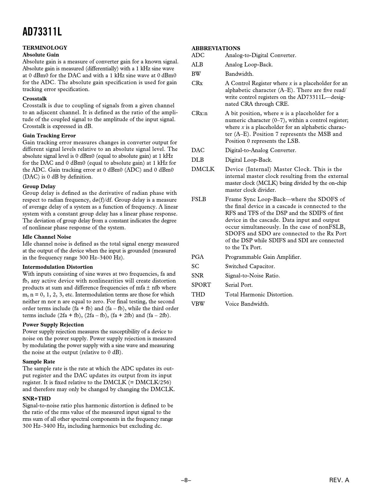 AD73311L. TERMINOLOGY. ABBREVIATIONS. Absolute Gain. Crosstalk. Gain Tracking Error. Group Delay. Idle Channel Noise