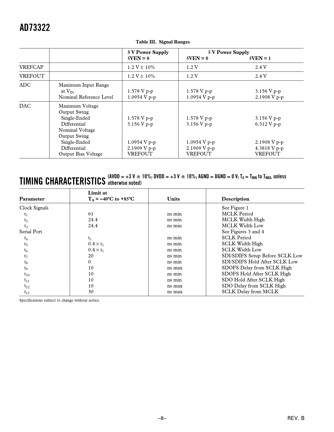 Seiten / Seite43 / 8 — AD73322. Table III. Signal Ranges. 3 V Power Supply. 5 V Power Supply. …
