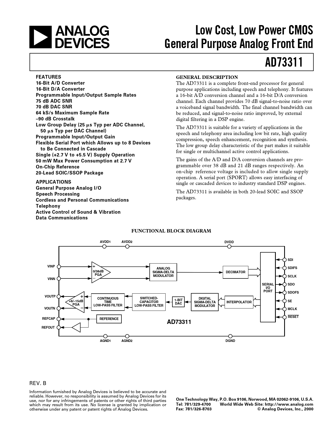 REV. B Information furnished by Analog Devices is believed to be accurate and reliable. However, no responsibility is assumed by Analog Devices for its use, nor for any infringements of patents or other rights of third parties
