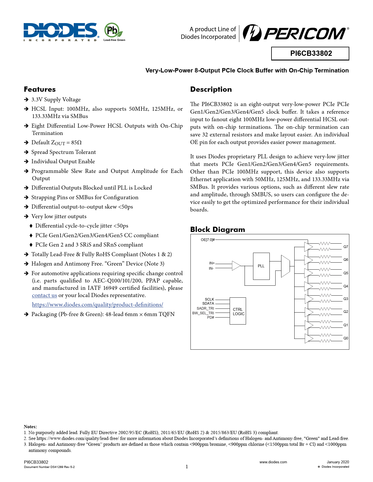 Lead-free Green. PI6CB33802. Very-Low-Power 8-Output PCIe Clock Buffer with On-Chip Termination. Features. Description