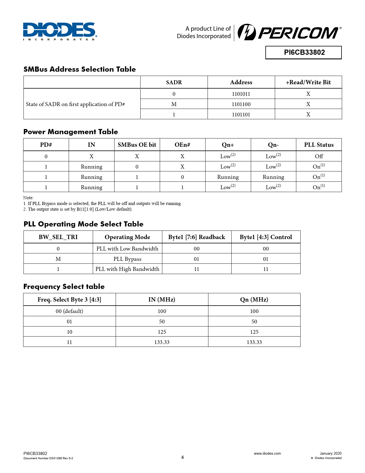 00 (default) 100 100 01 50 50 10 125 125 11 133.33 133.33 PI6CB33802 www.diodes.com January 2020 Document Number DS41289 Rev 5-2 4 Diodes Incorporated