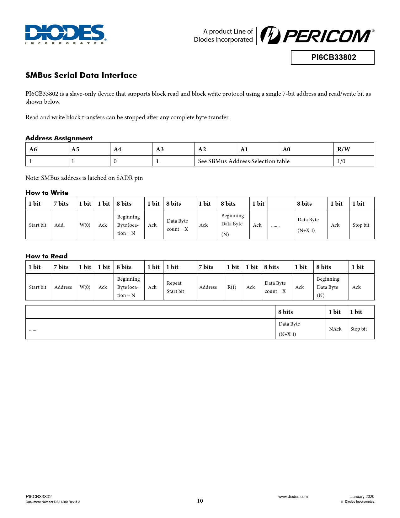 PI6CB33802. SMBus Serial Data Interface. Address Assignment. R/W. How to Write. 1 bit. 7 bits. 1 bit 1 bit 8 bits. 1 bit 8 bits. 8 bits