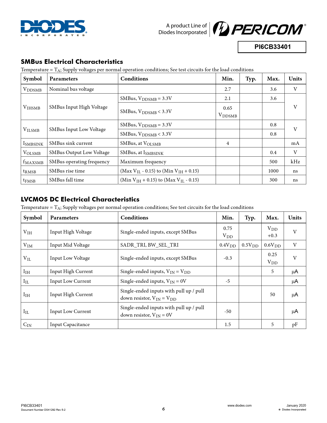 PI6CB33401. SMBus Electrical Characteristics. Symbol Parameters. Conditions. Min. Typ. Max. Units. LVCMOS DC Electrical Characteristics