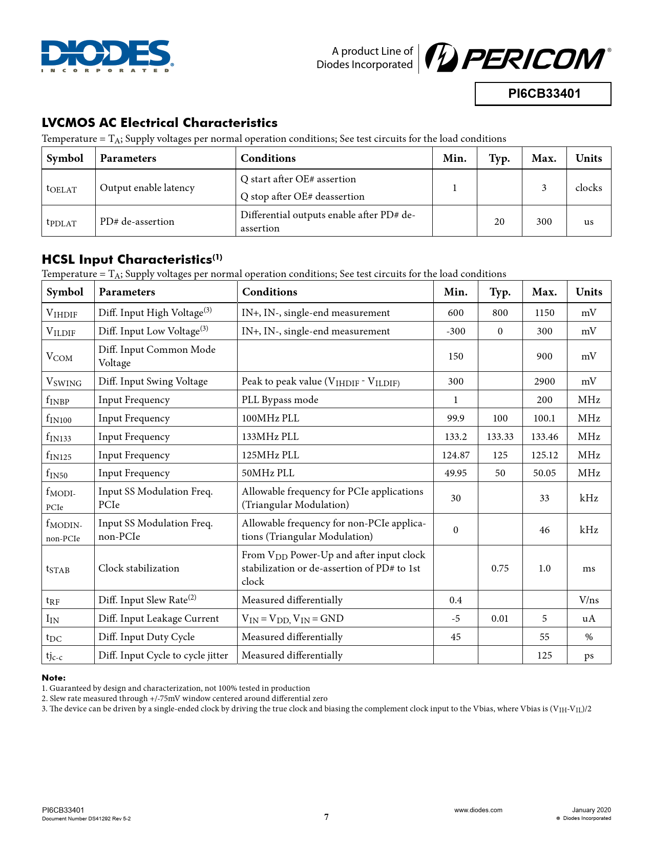 A product Line of Diodes Incorporated PI6CB33401LVCMOS AC Electrical Characteristics Temperature = TA; Supply voltages per normal operation conditions; See test circuits for the load conditions SymbolParametersConditionsMin.Typ.Max.Units Q start after OE# assertion tOELAT Output enable latency 1 3 clocks Q stop after OE# deassertion tPDLAT PD# de-assertion Differential outputs enable after PD# de- assertion 20 300 us HCSL Input Characteristics(1) Temperature = TA; Supply voltages per normal operation conditions; See test circuits for the load conditions Symbol ParametersConditionsMin.Typ.Max.Units VIHDIF Diff. Input High Voltage(3) IN+, IN-, single-end measurement 600 800 1150 mV VILDIF Diff. Input Low Voltage(3) IN+, IN-, single-end measurement -300 0 300 mV V Diff. Input Common Mode COM Voltage 150 900 mV VSWING Diff. Input Swing Voltage Peak to peak value (VIHDIF - VILDIF) 300 2900 mV fINBP Input Frequency PLL Bypass mode 1 200 MHz fIN100 Input Frequency 100MHz PLL 99.9 100 100.1 MHz fIN133 Input Frequency 133MHz PLL 133.2 133.33 133.46 MHz fIN125 Input Frequency 125MHz PLL 124.87 125 125.12 MHz fIN50 Input Frequency 50MHz PLL 49.95 50 50.05 MHz fMODI- Input SS Modulation Freq. Allowable frequency for PCIe applications PCIe PCIe (Triangular Modulation) 30 33 kHz fMODIN- Input SS Modulation Freq. Allowable frequency for non-PCIe applica- non-PCIe non-PCIe tions (Triangular Modulation) 0 46 kHz From VDD Power-Up and after input clock tSTAB Clock stabilization stabilization or de-assertion of PD# to 1st 0.75 1.0 ms clock tRF Diff. Input Slew Rate(2) Measured differentially 0.4 V/ns IIN Diff. Input Leakage Current VIN = VDD, VIN = GND -5 0.01 5 uA tDC Diff. Input Duty Cycle Measured differentially 45 55 % tjc-c Diff. Input Cycle to cycle jitter Measured differentially 125 ps Note: 1. Guaranteed by design and characterization, not 100% tested in production 2. Slew rate measured through +/-75mV window centered around differential zero 3. The device can be driven by a single-ended clock by driving the true clock and biasing the complement clock input to the Vbias, where Vbias is (VIH-VIL)/2 PI6CB33401 www.diodes.com January 2020 Document Number DS41292 Rev 5-2 7 Diodes Incorporated