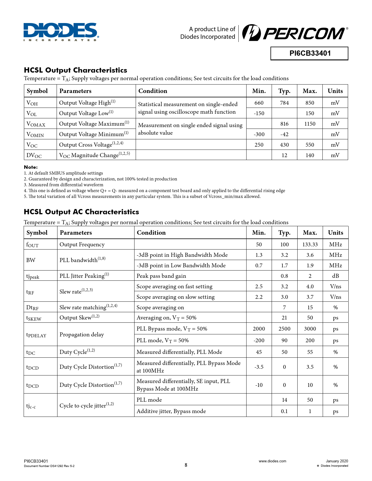 A product Line of Diodes Incorporated PI6CB33401HCSL Output Characteristics Temperature = TA; Supply voltages per normal operation conditions; See test circuits for the load conditions SymbolParametersConditionMin.Typ.Max.Units VOH Output Voltage High(1) Statistical measurement on single-ended 660 784 850 mV V signal using oscilloscope math function OL Output Voltage Low(1) -150 150 mV VOMAX Output Voltage Maximum(1) Measurement on single ended signal using 816 1150 mV V absolute value OMIN Output Voltage Minimum(1) -300 -42 mV VOC Output Cross Voltage(1,2,4) 250 430 550 mV DVOC VOC Magnitude Change(1,2,5) 12 140 mV Note: 1. At default SMBUS amplitude settings 2. Guaranteed by design and characterization, not 100% tested in production 3. Measured from differential waveform 4. This one is defined as voltage where Q+ = Q- measured on a component test board and only applied to the differential rising edge 5. The total variation of all Vcross measurements in any particular system. This is a subset of Vcross_min/max allowed. HCSL Output AC Characteristics Temperature = TA; Supply voltages per normal operation conditions; See test circuits for the load conditions SymbolParametersConditionMin.Typ.Max.Units fOUT Output Frequency 50 100 133.33 MHz -3dB point in High Bandwidth Mode 1.3 3.2 3.6 MHz BW PLL bandwidth(1,8) -3dB point in Low Bandwidth Mode 0.7 1.7 1.9 MHz tjpeak PLL Jitter Peaking(1) Peak pass band gain 0.8 2 dB Scope averaging on fast setting 2.5 3.2 4.0 V/ns tRF Slew rate(1,2,3) Scope averaging on slow setting 2.2 3.0 3.7 V/ns DtRF Slew rate matching(1,2,4) Scope averaging on 7 15 % tSKEW Output Skew(1,2) Averaging on, VT = 50% 21 50 ps PLL Bypass mode, VT = 50% 2000 2500 3000 ps tPDELAY Propagation delay PLL mode, VT = 50% -200 90 200 ps tDC Duty Cycle(1,2) Measured differentially, PLL Mode 45 50 55 % tDCD Duty Cycle Distortion(1,7) Measured differentially, PLL Bypass Mode at 100MHz -3.5 0 3.5 % tDCD Duty Cycle Distortion(1,7) Measured differentially, SE input, PLL Bypass Mode at 100MHz -10 0 10 % PLL mode 14 50 ps tjc-c Cycle to cycle jitter(1,2) Additive jitter, Bypass mode 0.1 1 ps PI6CB33401 www.diodes.com January 2020 Document Number DS41292 Rev 5-2 8 Diodes Incorporated