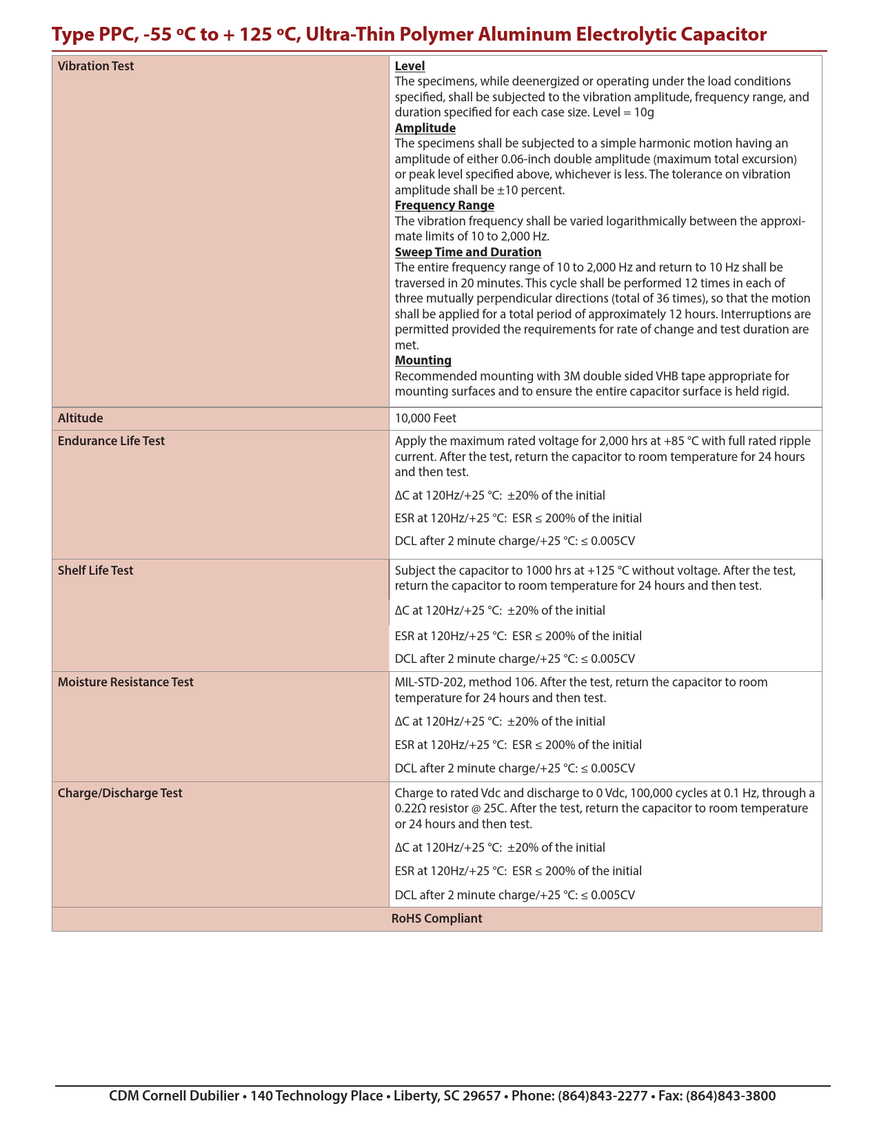 Type PPC, -55 ºC to + 125 ºC, Ultra-Thin Polymer Aluminum Electrolytic Capacitor Vibration Test Level Amplitude