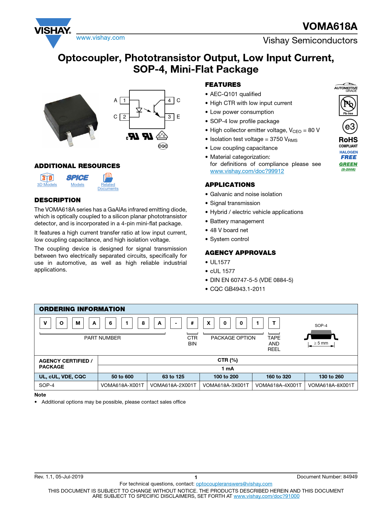 VOMA618A www.vishay.com Vishay Semiconductors Optocoupler, Phototransistor Output, Low Input Current,SOP-4, Mini-Flat PackageFEATURES • AEC-Q101 qualified A 1 4 C • High CTR with low input current • Low power consumption C 2 3 E • SOP-4 low profile package • High collector emitter voltage, VCEO = 80 V • Isolation test voltage = 3750 VRMS • Low coupling capacitance • Material categorization: ADDITIONAL RESOURCES for definitions of compliance please see www.vishay.com/doc?99912 D 33 D 3D Models Models Related APPLICATIONS Documents • Galvanic and noise isolation DESCRIPTION • Signal transmission The VOMA618A series has a GaAlAs infrared emitting diode, • Hybrid / electric vehicle applications which is optically coupled to a silicon planar phototransistor detector, and is incorporated in a 4-pin mini-flat package. • Battery management It features a high current transfer ratio at low input current, • 48 V board net low coupling capacitance, and high isolation voltage. • System control The coupling device is designed for signal transmission AGENCY APPROVALS between two electrically separated circuits, specifically for use in automotive, as well as high reliable industrial • UL1577 applications. • cUL 1577 • DIN EN 60747-5-5 (VDE 0884-5) • CQC GB4943.1-2011 ORDERING INFORMATIONVOMA618A-#X001T SOP-4 PART NUMBER CTR PACKAGE OPTION TAPE BIN AND ≥ 5 mm REEL AGENCY CERTIFIED /CTR (%)PACKAGE1 mAUL, cUL, VDE, CQC50 to 60063 to 125100 to 200160 to 320130 to 260 SOP-4 VOMA618A-X001T VOMA618A-2X001T VOMA618A-3X001T VOMA618A-4X001T VOMA618A-8X001T Note • Additional options may be possible, please contact sales office Rev. 1.1, 05-Jul-2019 1 Document Number: 84949 For technical questions, contact: optocoupleranswers@vishay.com THIS DOCUMENT IS SUBJECT TO CHANGE WITHOUT NOTICE. THE PRODUCTS DESCRIBED HEREIN AND THIS DOCUMENT ARE SUBJECT TO SPECIFIC DISCLAIMERS, SET FORTH AT www.vishay.com/doc?91000