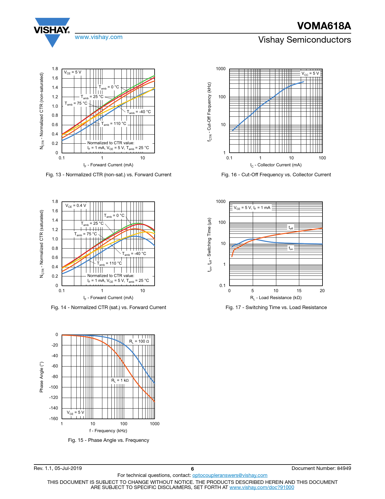 VOMA618A www.vishay.com Vishay Semiconductors Axis Title Axis Title 1.8 10000 1000 10000 V = 5 V CE V = 5 V CC 1.6 ) z 1.4 T = 0 °C amb H (k 1.2 T = 25 °C 1000 y 100 1000 amb (non-saturated) T = 75 °C R 1.0 amb ine ne ne ne ne ine T = -40 °C amb d CT 0.8 2nd l 1st li e 2nd li 1st li 2nd li 2nd l liz a 0.6 T = 110 °C amb 100 10 100 ut-Off Frequenc C orm - N 0.4 R - R f CT 0.2 Normalized to CTR value: CTN I = 1 mA, V = 5 V, T = 25 °C F CE amb 0 10 1 10 0.1 1 10 0.1 1 10 100 I - Forward Current (mA) I - Collector Current (mA) F C Fig. 13 - Normalized CTR (non-sat.) vs. Forward Current Fig. 16 - Cut-Off Frequency vs. Collector Current Axis Title Axis Title 1.8 10000 1000 10000 V = 0.4 V CE V = 5 V, I = 1 mA 1.6 CE F T = 0 °C amb 1.4 s) T = 25 °C 100 amb (μ t (saturated) e 1.2 1000 off 1000 R T = 75 °C im ine T amb 1.0 ne ne ne ne ine d C 10 2nd l e 0.8 1st li t liz 2nd li itching T on 1st li 2nd li a 2nd l T = -40 °C w amb S 0.6 100 - 100 orm f N T = 110 °C of - amb 1 0.4 , t R t on CTN 0.2 Normalized to CTR value: I = 1 mA, V = 5 V, T = 25 °C F CE amb 0 10 0.1 10 0.1 1 10 0 5 10 15 20 I - Forward Current (mA) R - Load Resistance (kΩ) F L Fig. 14 - Normalized CTR (sat.) vs. Forward Current Fig. 17 - Switching Time vs. Load Resistance Axis Title 0 10000 R = 100 Ω L -20 -40 1000 (°) -60 gle ne ne ine n -80 R = 1 kΩ L 1st li 2nd l 2nd li ase A -100 h P 100 -120 -140 V = 5 V CE -160 10 1 10 100 1000 f - Frequency (kHz) Fig. 15 - Phase Angle vs. Frequency Rev. 1.1, 05-Jul-2019 6 Document Number: 84949 For technical questions, contact: optocoupleranswers@vishay.com THIS DOCUMENT IS SUBJECT TO CHANGE WITHOUT NOTICE. THE PRODUCTS DESCRIBED HEREIN AND THIS DOCUMENT ARE SUBJECT TO SPECIFIC DISCLAIMERS, SET FORTH AT www.vishay.com/doc?91000