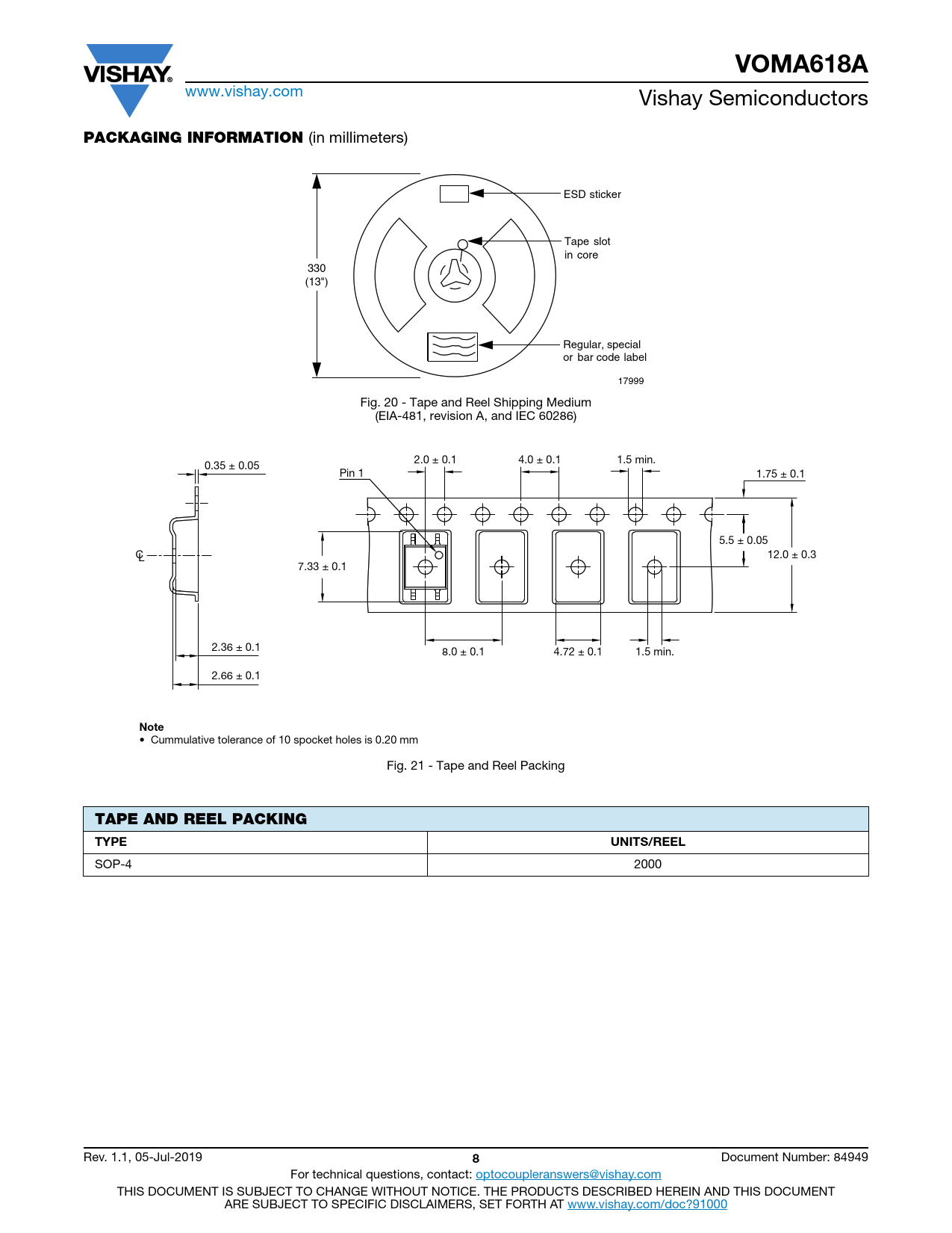 VOMA618A www.vishay.com Vishay Semiconductors PACKAGING INFORMATION (in millimeters) ESD sticker Tape slot in core 330 (13") Regular, special or bar code label 17999 Fig. 20 - Tape and Reel Shipping Medium (EIA-481, revision A, and IEC 60286) 2.0 ± 0.1 4.0 ± 0.1 1.5 min. 0.35 ± 0.05 Pin 1 1.75 ± 0.1 5.5 ± 0.05 C 12.0 ± 0.3 L 7.33 ± 0.1 2.36 ± 0.1 8.0 ± 0.1 4.72 ± 0.1 1.5 min. 2.66 ± 0.1 Note • Cummulative tolerance of 10 spocket holes is 0.20 mm Fig. 21 - Tape and Reel Packing TAPE AND REEL PACKING TYPEUNITS/REEL SOP-4 2000 Rev. 1.1, 05-Jul-2019 8 Document Number: 84949 For technical questions, contact: optocoupleranswers@vishay.com THIS DOCUMENT IS SUBJECT TO CHANGE WITHOUT NOTICE. THE PRODUCTS DESCRIBED HEREIN AND THIS DOCUMENT ARE SUBJECT TO SPECIFIC DISCLAIMERS, SET FORTH AT www.vishay.com/doc?91000