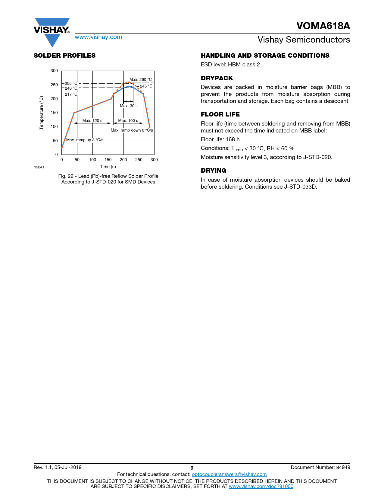 VOMA618A www.vishay.com Vishay Semiconductors SOLDER PROFILESHANDLING AND STORAGE CONDITIONS Axis Title ESD level: HBM class 2 300 10000 Max. 260 °C DRYPACK 255 °C 250 245 °C 240 °C Devices are packed in moisture barrier bags (MBB) to 217 °C prevent the products from moisture absorption during 200 1000 transportation and storage. Each bag contains a desiccant. Max. 30 s ine ne ne 150 FLOOR LIFE 1st li 2nd l 2nd li Max. 120 s Max. 100 s Floor life (time between soldering and removing from MBB) 100 100 Temperature (°C) Max. ramp down 6 °C/s must not exceed the time indicated on MBB label: 50 Max. ramp up 3 °C/s Floor life: 168 h Conditions: Tamb < 30 °C, RH < 60 % 0 10 Moisture sensitivity level 3, according to J-STD-020. 0 50 100 150 200 250 300 19841 Time (s) DRYING Fig. 22 - Lead (Pb)-free Reflow Solder Profile According to J-STD-020 for SMD Devices In case of moisture absorption devices should be baked before soldering. Conditions see J-STD-033D. Rev. 1.1, 05-Jul-2019 9 Document Number: 84949 For technical questions, contact: optocoupleranswers@vishay.com THIS DOCUMENT IS SUBJECT TO CHANGE WITHOUT NOTICE. THE PRODUCTS DESCRIBED HEREIN AND THIS DOCUMENT ARE SUBJECT TO SPECIFIC DISCLAIMERS, SET FORTH AT www.vishay.com/doc?91000