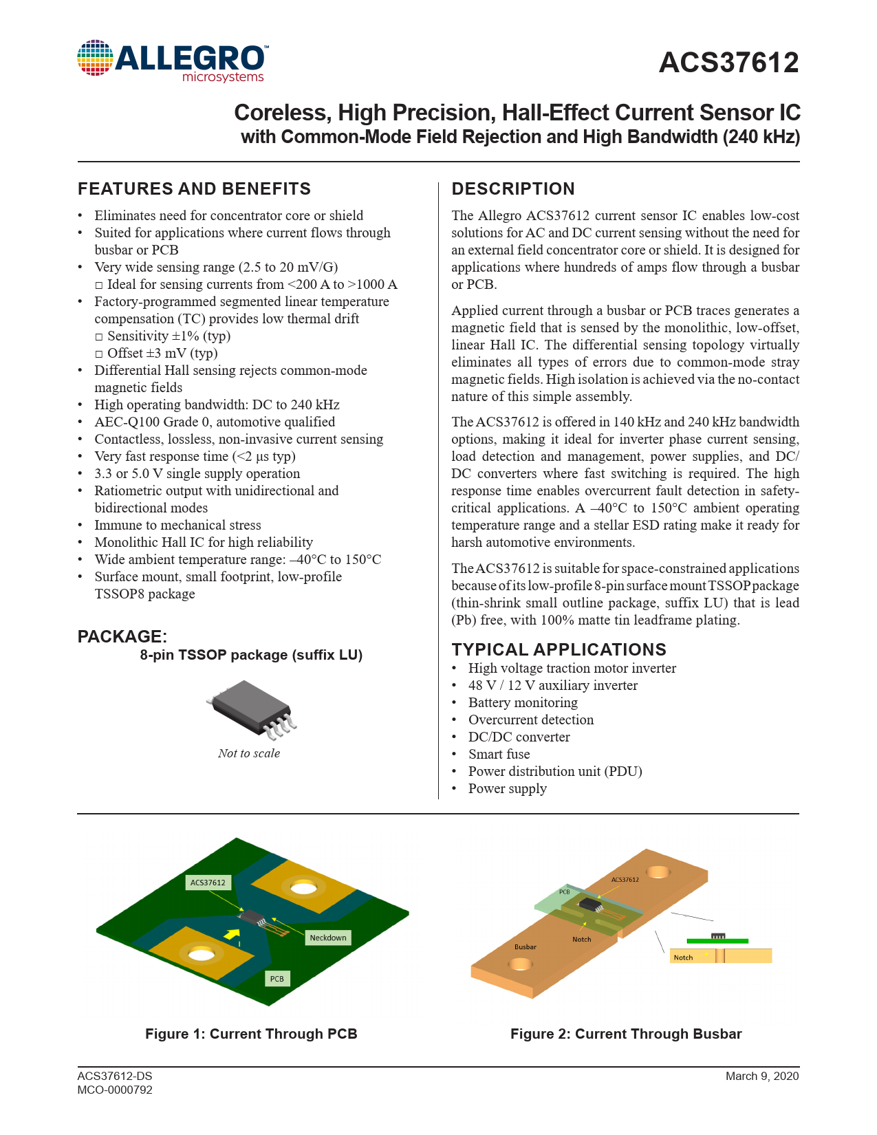 ACS37612Coreless, High Precision, Hall-Effect Current Sensor ICwith Common-Mode Field Rejection and High Bandwidth (240 kHz)FEATURES AND BENEFITSDESCRIPTION • Eliminates need for concentrator core or shield The Allegro ACS37612 current sensor IC enables low-cost • Suited for applications where current flows through solutions for AC and DC current sensing without the need for busbar or PCB an external field concentrator core or shield. It is designed for • Very wide sensing range (2.5 to 20 mV/G) applications where hundreds of amps flow through a busbar □ Ideal for sensing currents from <200 A to >1000 A or PCB. • Factory-programmed segmented linear temperature Applied current through a busbar or PCB traces generates a compensation (TC) provides low thermal drift magnetic field that is sensed by the monolithic, low-offset, □ Sensitivity ±1% (typ) linear Hall IC. The differential sensing topology virtually □ Offset ±3 mV (typ) eliminates all types of errors due to common-mode stray • Differential Hall sensing rejects common-mode magnetic fields. High isolation is achieved via the no-contact magnetic fields nature of this simple assembly. • High operating bandwidth: DC to 240 kHz • AEC-Q100 Grade 0, automotive qualified The ACS37612 is offered in 140 kHz and 240 kHz bandwidth • Contactless, lossless, non-invasive current sensing options, making it ideal for inverter phase current sensing, • Very fast response time (<2 μs typ) load detection and management, power supplies, and DC/ • 3.3 or 5.0 V single supply operation DC converters where fast switching is required. The high • Ratiometric output with unidirectional and response time enables overcurrent fault detection in safety- bidirectional modes critical applications. A –40°C to 150°C ambient operating • Immune to mechanical stress temperature range and a stellar ESD rating make it ready for • Monolithic Hall IC for high reliability harsh automotive environments. • Wide ambient temperature range: –40°C to 150°C The ACS37612 is suitable for space-constrained applications • Surface mount, small footprint, low-profile because of its low-profile 8-pin surface mount TSSOP package TSSOP8 package (thin-shrink small outline package, suffix LU) that is lead (Pb) free, with 100% matte tin leadframe plating. PACKAGE:8-pin TSSOP package (suffix LU)TYPICAL APPLICATIONS • High voltage traction motor inverter • 48 V / 12 V auxiliary inverter • Battery monitoring • Overcurrent detection • DC/DC converter Not to scale • Smart fuse • Power distribution unit (PDU) • Power supply Figure 1: Current Through PCBFigure 2: Current Through Busbar ACS37612-DS March 9, 2020 MCO-0000792