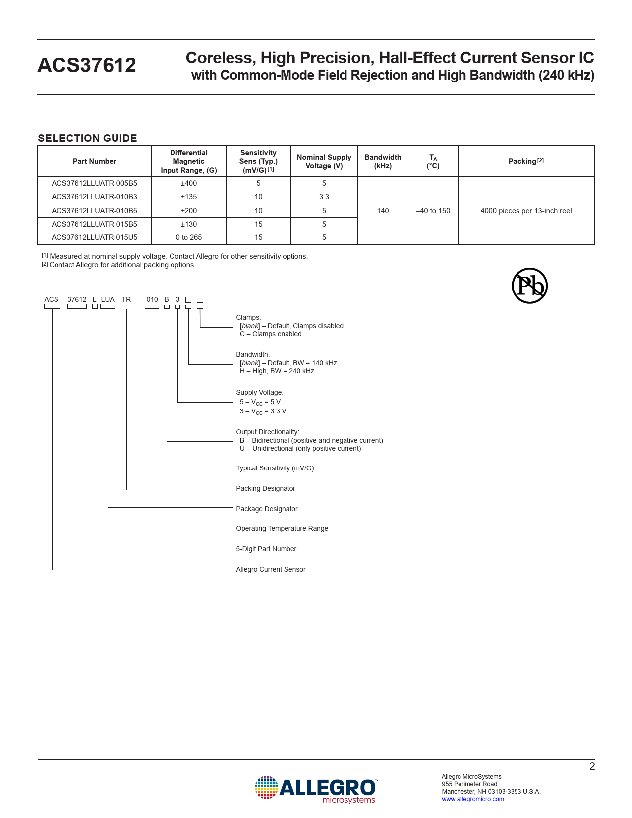 ACS37612LLUATR-005B5 ±400 5 5 ACS37612LLUATR-010B3 ±135 10 3.3 ACS37612LLUATR-010B5 ±200 10 5 140 –40 to 150 4000 pieces per 13-inch reel ACS37612LLUATR-015B5 ±130 15 5 ACS37612LLUATR-015U5 0 to 265 15 5 [1] Measured at nominal supply voltage. Contact Allegro for other sensitivity options. [2] Contact Allegro for additional packing options. ACS 37612 L LUA TR - 010 B 3 Clamps: [blank] – Default, Clamps disabled C – Clamps enabled Bandwidth: [blank] – Default, BW = 140 kHz H – High, BW = 240 kHz Supply Voltage: 5 – VCC = 5 V 3 – VCC = 3.3 V Output Directionality: B – Bidirectional (positive and negative current) U – Unidirectional (only positive current) Typical Sensitivity (mV/G) Packing Designator Package Designator Operating Temperature Range 5-Digit Part Number Allegro Current Sensor 2 Allegro MicroSystems 955 Perimeter Road Manchester, NH 03103-3353 U.S.A. www.allegromicro.com