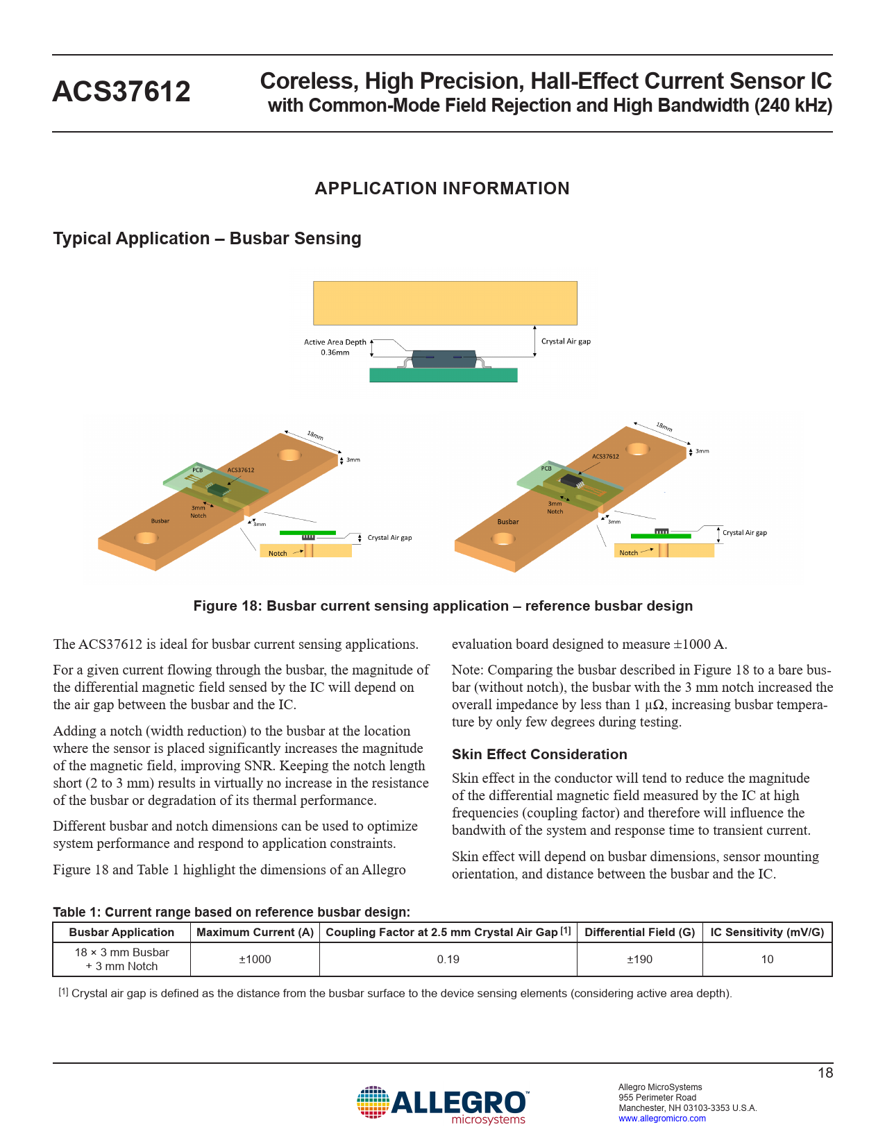 link to page 18 link to page 18 link to page 18 Coreless, High Precision, Hall-Effect Current Sensor ICACS37612with Common-Mode Field Rejection and High Bandwidth (240 kHz)APPLICATION INFORMATIONTypical Application – Busbar SensingFigure 18: Busbar current sensing application – reference busbar design The ACS37612 is ideal for busbar current sensing applications. evaluation board designed to measure ±1000 A. For a given current flowing through the busbar, the magnitude of Note: Comparing the busbar described in Figure 18 to a bare bus- the differential magnetic field sensed by the IC will depend on bar (without notch), the busbar with the 3 mm notch increased the the air gap between the busbar and the IC. overall impedance by less than 1 µΩ, increasing busbar tempera- Adding a notch (width reduction) to the busbar at the location ture by only few degrees during testing. where the sensor is placed significantly increases the magnitude Skin Effect Consideration of the magnetic field, improving SNR. Keeping the notch length short (2 to 3 mm) results in virtually no increase in the resistance Skin effect in the conductor will tend to reduce the magnitude of the busbar or degradation of its thermal performance. of the differential magnetic field measured by the IC at high frequencies (coupling factor) and therefore will influence the Different busbar and notch dimensions can be used to optimize bandwith of the system and response time to transient current. system performance and respond to application constraints. Skin effect will depend on busbar dimensions, sensor mounting Figure 18 and Table 1 highlight the dimensions of an Allegro orientation, and distance between the busbar and the IC. Table 1: Current range based on reference busbar design:Busbar ApplicationMaximum Current (A) Coupling Factor at 2.5 mm Crystal Air Gap [1] Differential Field (G) IC Sensitivity (mV/G) 18 × 3 mm Busbar + 3 mm Notch ±1000 0.19 ±190 10 [1] Crystal air gap is defined as the distance from the busbar surface to the device sensing elements (considering active area depth). 18 Allegro MicroSystems 955 Perimeter Road Manchester, NH 03103-3353 U.S.A. www.allegromicro.com