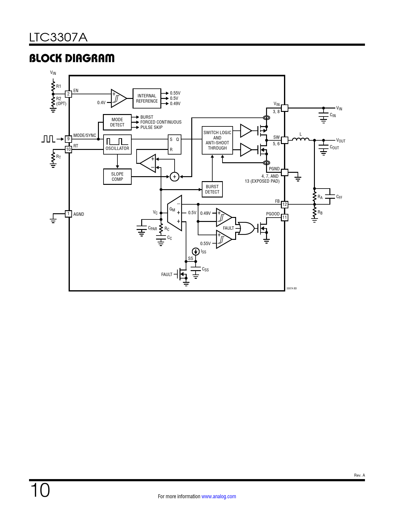 VIN R1 EN 2 + INTERNAL 0.55V R2 0.5V (OPT) 0.4V – REFERENCE 0.49V VIN VIN 3, 8 CIN MODE BURST DETECT FORCED CONTINUOUS PULSE SKIP SWITCH LOGIC L MODE/SYNC AND SW 9 S Q VOUT ANTI-SHOOT RT 5, 6 10 OSCILLATOR THROUGH COUT R RT + – PGND SLOPE 4, 7, AND COMP 13 (EXPOSED PAD) BURST DETECT RA CFF FB 12 GM 1 AGND VC 0.5V 0.49V + PGOOD RB 11 – CPAR R FAULT C + CC 0.55V – ISS SS CSS FAULT 3307A BD Rev. A 10 For more information www.analog.com Document Outline Features Applications Typical Application Description Absolute Maximum Ratings Order Information Pin Configuration Electrical Characteristics Typical Performance Characteristics Pin Functions Block Diagram Operation Applications Information Typical Applications Package Description Revision History Typical Application Related Parts