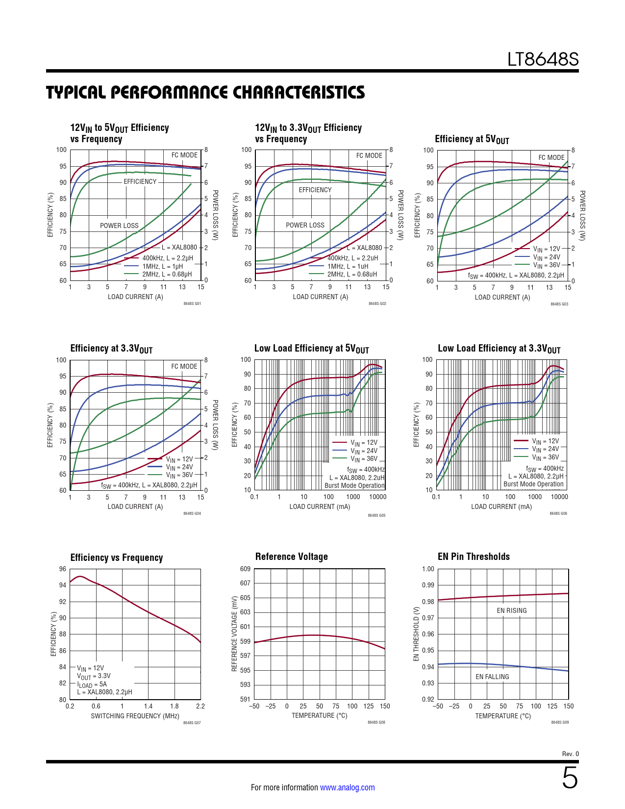 96 609 1.00 607 94 0.99 605 92 0.98 603 EN RISING 90 0.97 TAGE (mV) 601 88 0.96 599 86 EFFICIENCY (%) 0.95 597 EN THRESHOLD (V) 84 VIN = 12V REFERENCE VOL 595 0.94 VOUT = 3.3V EN FALLING 82 ILOAD = 5A 593 0.93 L = XAL8080, 2.2µH 80 591 0.92 0.2 0.6 1 1.4 1.8 2.2 –50 –25 0 25 50 75 100 125 150 –50 –25 0 25 50 75 100 125 150 SWITCHING FREQUENCY (MHz) TEMPERATURE (°C) TEMPERATURE (°C) 8648S G07 8648S G08 8648S G09 Rev. 0 For more information www.analog.com 5 Document Outline Features Applications Typical Application Description Absolute Maximum Ratings Order Information Pin Configuration Electrical Characteristics Typical Performance Characteristics Pin Functions Block Diagram Operation Applications Information Typical Applications Package Description Typical Applications Related Parts