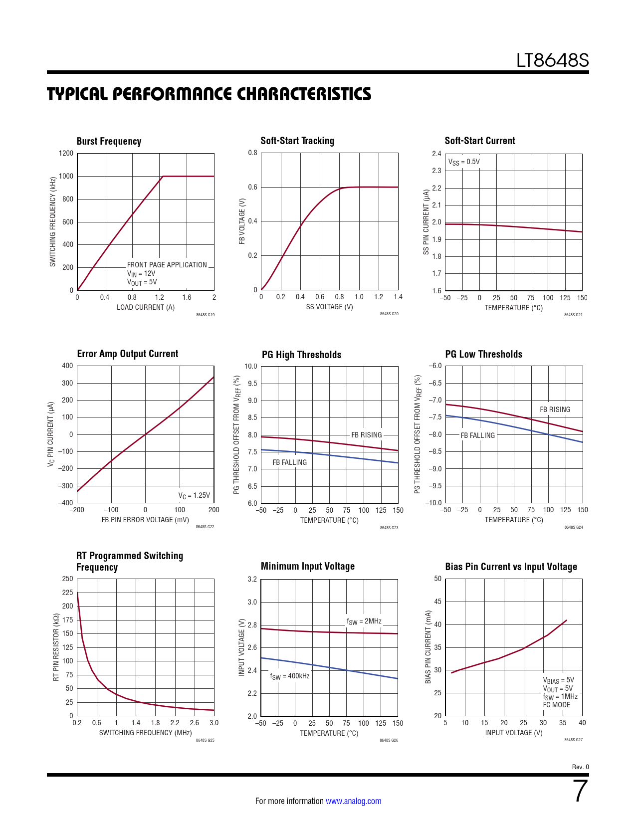 400 10.0 –6.0 300 9.5 (%) –6.5 (%) REF REF 200 9.0 –7.0 FB RISING 100 8.5 –7.5 0 8.0 FB RISING –8.0 FB FALLING –100 7.5 –8.5 PIN CURRENT (µA) FB FALLING V C –200 7.0 –9.0 –300 6.5 –9.5 PG THRESHOLD OFFSET FROM V PG THRESHOLD OFFSET FROM V VC = 1.25V –400 6.0 –10.0 –200 –100 0 100 200 –50 –25 0 25 50 75 100 125 150 –50 –25 0 25 50 75 100 125 150 FB PIN ERROR VOLTAGE (mV) TEMPERATURE (°C) TEMPERATURE (°C) 8648S G22 8648S G23 8648S G24