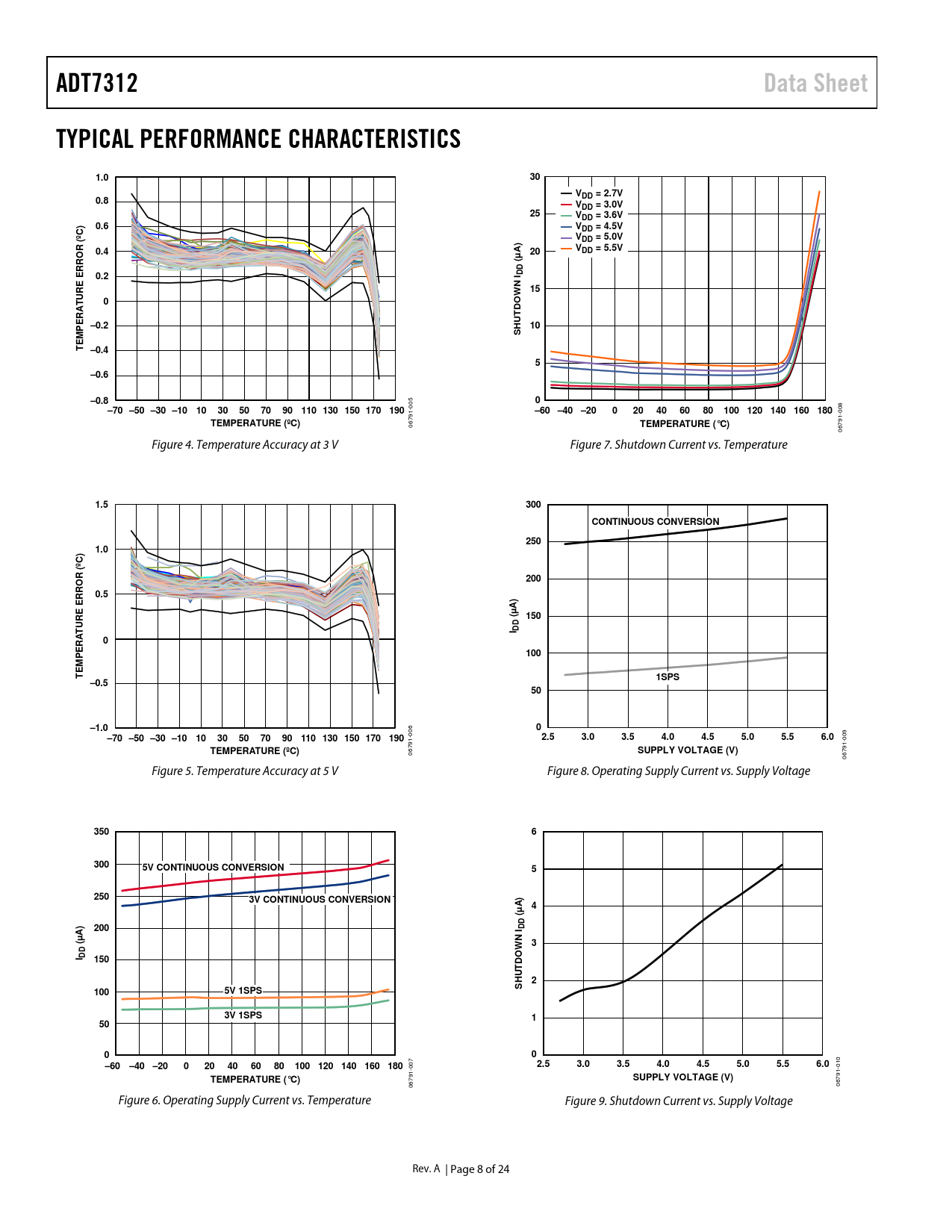 ADT7312Data SheetTYPICAL PERFORMANCE CHARACTERISTICS1.030VDD = 2.7V0.8VDD = 3.0V25VDD = 3.6V0.6VDD = 4.5VºC)VDD = 5.0VR (0.4A)20VDD = 5.5Vµ (RRODDE0.2N I15UREW0DORAT E P –0.2HUT10MSE T –0.45–0.6–0.80 005 –70 –50 –30 –101030507090110 130 150 170 190–60 –40 –20020406080100 120 140 160 180 008 TEMPERATURE (ºC) 06791- TEMPERATURE (°C) 06791- Figure 4. Temperature Accuracy at 3 V Figure 7. Shutdown Current vs. Temperature 1.5300CONTINUOUS CONVERSION2501.0ºC) R (200RRO0.5EA) µ (150URE TI DDA0100EMPER T1SPS–0.550–1.00 006 –70 –50 –30 –101030507090110 130 150 170 1902.53.03.54.04.55.05.56.0 009 TEMPERATURE (ºC) 06791- SUPPLY VOLTAGE (V) 06791- Figure 5. Temperature Accuracy at 5 V Figure 8. Operating Supply Current vs. Supply Voltage 35063005V CONTINUOUS CONVERSION52503V CONTINUOUS CONVERSIONA)4µ ()200DDA (µN I3WI DD150DOHUT2S1005V 1SPS3V 1SPS15000–60–40 –20020406080100 120 140 160 180 007 2.53.03.54.04.55.05.56.0 010 TEMPERATURE (°C)SUPPLY VOLTAGE (V) 06791- 06791- Figure 6. Operating Supply Current vs. Temperature Figure 9. Shutdown Current vs. Supply Voltage Rev. A | Page 8 of 24 Document Outline Features Applications General Description Product Highlights Functional Block Diagram Table of Contents Revision History Specifications SPI Timing Specifications Absolute Maximum Ratings ESD Caution Pad Configuration and Function Descriptions Die Bond Pad Coordinates Typical Performance Characteristics Theory of Operation Circuit Description Converter Architecture Normal Mode (Continuous Conversion Mode) One-Shot Mode CT and INT Operation in One-Shot Mode 1 SPS Mode Shutdown Mode Fault Queue Temperature Data Format Temperature Conversion Formulas 16-Bit Temperature Data Format 13-Bit Temperature Data Format 10-Bit Temperature Data Format 9-Bit Temperature Data Format Registers Status Register Configuration Register Temperature Value Register ID Register TCRIT Setpoint Register THYST Setpoint Register THIGH Setpoint Register TLOW Setpoint Register Serial Interface SPI Command Byte Writing Data Reading Data Interfacing to DSPs or Microcontrollers Resetting the Serial Interface INT and CT Outputs Undertemperature and Overtemperature Detection Comparator Mode Interrupt Mode Redundant Critical Generator Applications Information Thermal Response Time Supply Decoupling Powering from a Switching Regulator Temperature Monitoring Quick Guide to Measuring Temperature Outline Dimensions Ordering Guide Automotive Products
