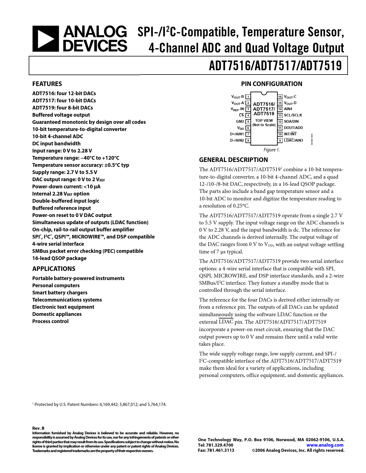 external LDAC pin. The ADT7516/ADT7517/ADT7519 incorporate a power-on reset circuit, ensuring that the DAC output powers up to 0 V and remains there until a valid write takes place. The wide supply voltage range, low supply current, and SPI-/ I2C-compatible interface of the ADT7516/ADT7517/ADT7519 make them ideal for a variety of applications, including personal computers, office equipment, and domestic appliances. 1 Protected by U.S. Patent Numbers: 6,169,442; 5,867,012; and 5,764,174.