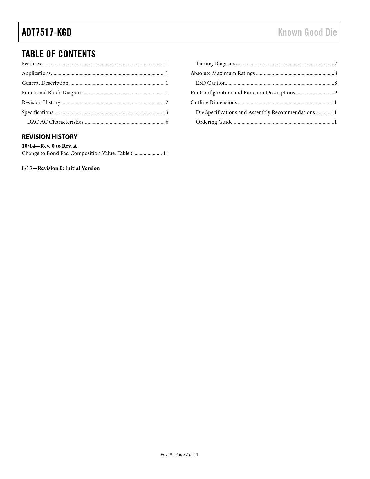 link to page 1 link to page 1 link to page 1 link to page 1 link to page 2 link to page 3 link to page 6 link to page 7 link to page 8 link to page 8 link to page 9 link to page 11 link to page 11 link to page 11 ADT7517-KGDKnown Good DieTABLE OF CONTENTS Features .. 1 Timing Diagrams ..7 Applications ... 1 Absolute Maximum Ratings ..8 General Description ... 1 ESD Caution...8 Functional Block Diagram .. 1 Pin Configuration and Function Descriptions ..9 Revision History ... 2 Outline Dimensions ... 11 Specifications ... 3 Die Specifications and Assembly Recommendations ... 11 DAC AC Characteristics .. 6 Ordering Guide .. 11 REVISION HISTORY 10/14—Rev. 0 to Rev. A Change to Bond Pad Composition Value, Table 6 ... 11 8/13—Revision 0: Initial Version Rev. A | Page 2 of 11 Document Outline FEATURES APPLICATIONS GENERAL DESCRIPTION FUNCTIONAL BLOCK DIAGRAM TABLE OF CONTENTS REVISION HISTORY SPECIFICATIONS DAC AC CHARACTERISTICS TIMING DIAGRAMS ABSOLUTE MAXIMUM RATINGS ESD CAUTION PIN CONFIGURATION AND FUNCTION DESCRIPTIONS OUTLINE DIMENSIONS DIE SPECIFICATIONS AND ASSEMBLY RECOMMENDATIONS ORDERING GUIDE