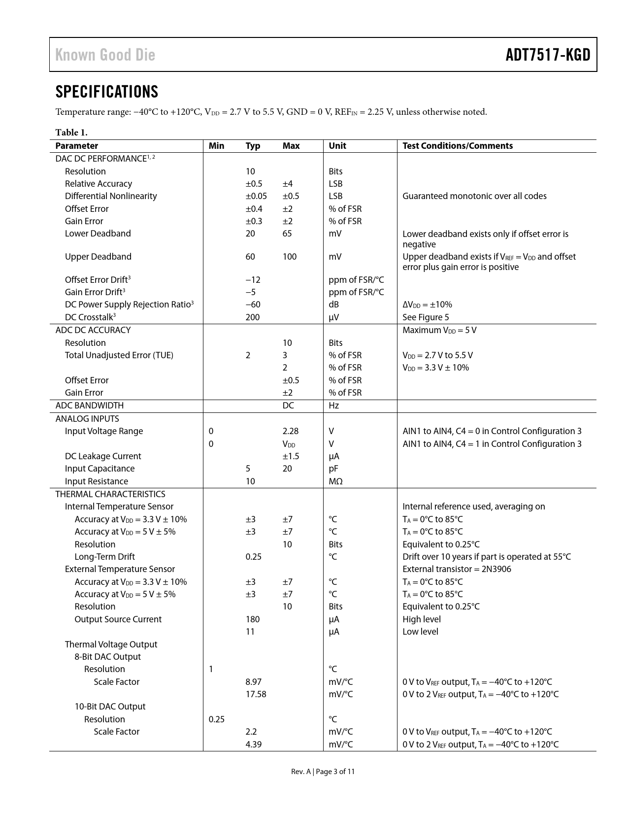 link to page 7 link to page 5 link to page 5 Known Good DieADT7517-KGDSPECIFICATIONS Temperature range: −40°C to +120°C, VDD = 2.7 V to 5.5 V, GND = 0 V, REFIN = 2.25 V, unless otherwise noted. Table 1. ParameterMinTypMaxUnitTest Conditions/Comments DAC DC PERFORMANCE1, 2 Resolution 10 Bits Relative Accuracy ±0.5 ±4 LSB Differential Nonlinearity ±0.05 ±0.5 LSB Guaranteed monotonic over all codes Offset Error ±0.4 ±2 % of FSR Gain Error ±0.3 ±2 % of FSR Lower Deadband 20 65 mV Lower deadband exists only if offset error is negative Upper Deadband 60 100 mV Upper deadband exists if VREF = VDD and offset error plus gain error is positive Offset Error Drift3 −12 ppm of FSR/°C Gain Error Drift3 −5 ppm of FSR/°C DC Power Supply Rejection Ratio3 −60 dB ∆VDD = ±10% DC Crosstalk3 200 µV See Figure 5 ADC DC ACCURACY Maximum VDD = 5 V Resolution 10 Bits Total Unadjusted Error (TUE) 2 3 % of FSR VDD = 2.7 V to 5.5 V 2 % of FSR VDD = 3.3 V ± 10% Offset Error ±0.5 % of FSR Gain Error ±2 % of FSR ADC BANDWIDTH DC Hz ANALOG INPUTS Input Voltage Range 0 2.28 V AIN1 to AIN4, C4 = 0 in Control Configuration 3 0 VDD V AIN1 to AIN4, C4 = 1 in Control Configuration 3 DC Leakage Current ±1.5 µA Input Capacitance 5 20 pF Input Resistance 10 MΩ THERMAL CHARACTERISTICS Internal Temperature Sensor Internal reference used, averaging on Accuracy at VDD = 3.3 V ± 10% ±3 ±7 °C TA = 0°C to 85°C Accuracy at VDD = 5 V ± 5% ±3 ±7 °C TA = 0°C to 85°C Resolution 10 Bits Equivalent to 0.25°C Long-Term Drift 0.25 °C Drift over 10 years if part is operated at 55°C External Temperature Sensor External transistor = 2N3906 Accuracy at VDD = 3.3 V ± 10% ±3 ±7 °C TA = 0°C to 85°C Accuracy at VDD = 5 V ± 5% ±3 ±7 °C TA = 0°C to 85°C Resolution 10 Bits Equivalent to 0.25°C Output Source Current 180 µA High level 11 µA Low level Thermal Voltage Output 8-Bit DAC Output Resolution 1 °C Scale Factor 8.97 mV/°C 0 V to VREF output, TA = −40°C to +120°C 17.58 mV/°C 0 V to 2 VREF output, TA = −40°C to +120°C 10-Bit DAC Output Resolution 0.25 °C Scale Factor 2.2 mV/°C 0 V to VREF output, TA = −40°C to +120°C 4.39 mV/°C 0 V to 2 VREF output, TA = −40°C to +120°C Rev. A | Page 3 of 11 Document Outline FEATURES APPLICATIONS GENERAL DESCRIPTION FUNCTIONAL BLOCK DIAGRAM TABLE OF CONTENTS REVISION HISTORY SPECIFICATIONS DAC AC CHARACTERISTICS TIMING DIAGRAMS ABSOLUTE MAXIMUM RATINGS ESD CAUTION PIN CONFIGURATION AND FUNCTION DESCRIPTIONS OUTLINE DIMENSIONS DIE SPECIFICATIONS AND ASSEMBLY RECOMMENDATIONS ORDERING GUIDE
