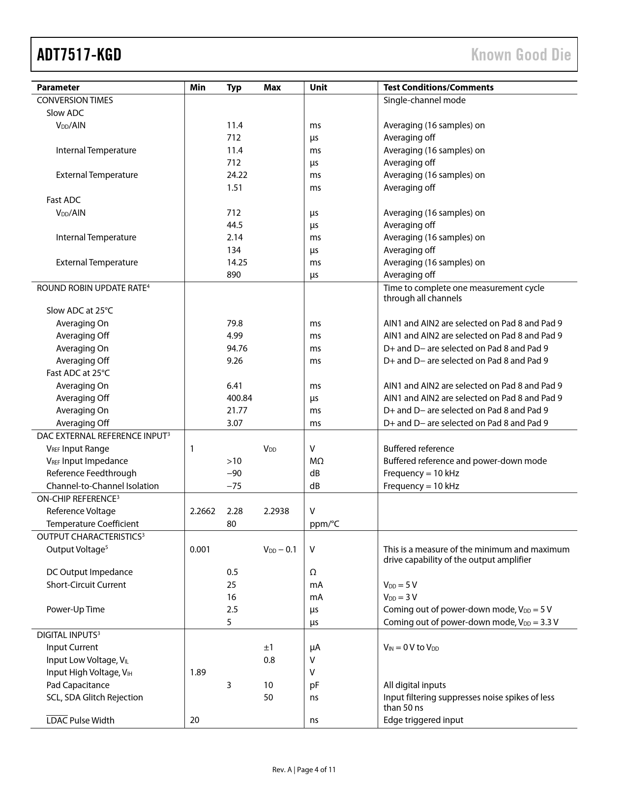 Seiten / Seite11 / 4 — ADT7517-KGD. Known Good Die. Parameter. Min. Typ. Max. Unit. Test …